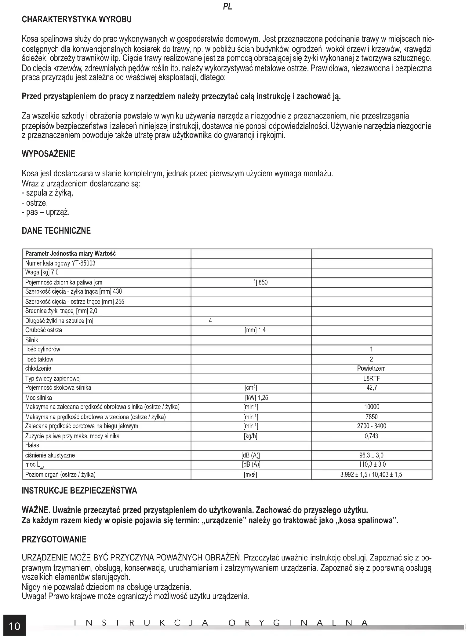 CHARAKTERYSTYKA WYROBU Kosa spalinowa służy do prac wykonywanych w gospodarstwie domowym. Jest przeznaczona podcinania trawy w miejscach nie- dostępnych dla konwencjonalnych kosiarek do trawy, np. w pobliżu ścian budynków, ogrodzeń, wokół drzew i krzewów, krawędzi ścieżek, obrzeży trawników itp. Cięcie trawy realizowane jest za pomocą obracającej się żyłki wykonanej z tworzywa sztucznego. Do cięcia krzewów, zdrewniałych pędów roślin itp. należy wykorzystywać metalowe ostrze. Prawidłowa, niezawodna i bezpieczna praca przyrządu jest zależna od właściwej eksploatacji, dlatego: Przed przystąpieniem do pracy z narzędziem należy przeczytać całą instrukcję i zachować ją. Za wszelkie szkody i obrażenia powstałe w wyniku używania narzędzia niezgodnie z przeznaczeniem, nie przestrzegania przepisów bezpieczeństwa i zaleceń niniejszej instrukcji, dostawca nie ponosi odpowiedzialności. Używanie narzędzia niezgodnie z przeznaczeniem powoduje także utratę praw użytkownika do gwarancji i rękojmi. WYPOSAŻENIE Kosa jest dostarczana w stanie kompletnym, jednak przed pierwszym użyciem wymaga montażu. Wraz z urządzeniem dostarczane są: - szpula z żyłką, - ostrze, - pas – uprząż. DANE TECHNICZNE Parametr Jednostka miary Wartość Numer katalogowy YT-85003 Waga [kg] 7,0 Pojemność zbiornika paliwa [cm