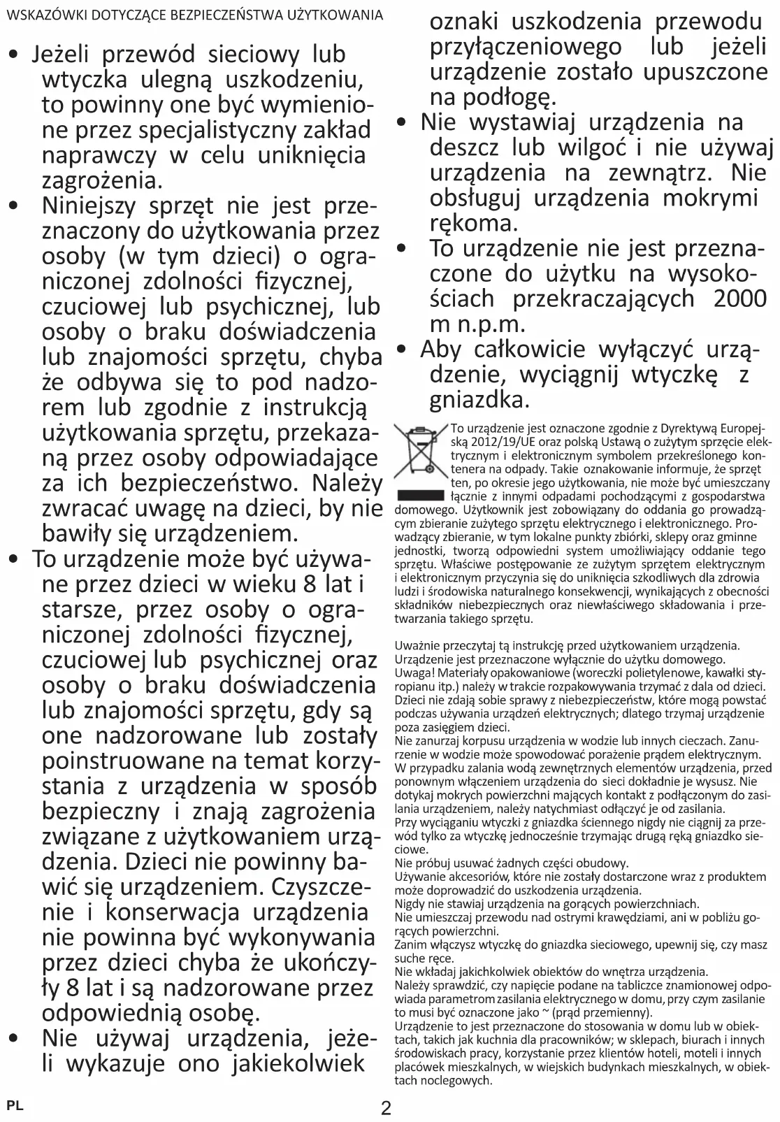 - Niniejszy sprzęt nie jest prze- znaczony do użytkowania przez osoby (w tym dzieci) o ogra- niczonej zdolności zycznej, czuciowej lub psychicznej, lub osoby o braku doświadczenia lub znajomości sprzętu, chyba że odbywa się to pod nadzo- rem lub zgodnie z instrukcją użytkowania sprzętu, przekaza- ną przez osoby odpowiadające za ich bezpieczeństwo. Należy zwracać uwagę na dzieci, by nie bawiły się urządzeniem.