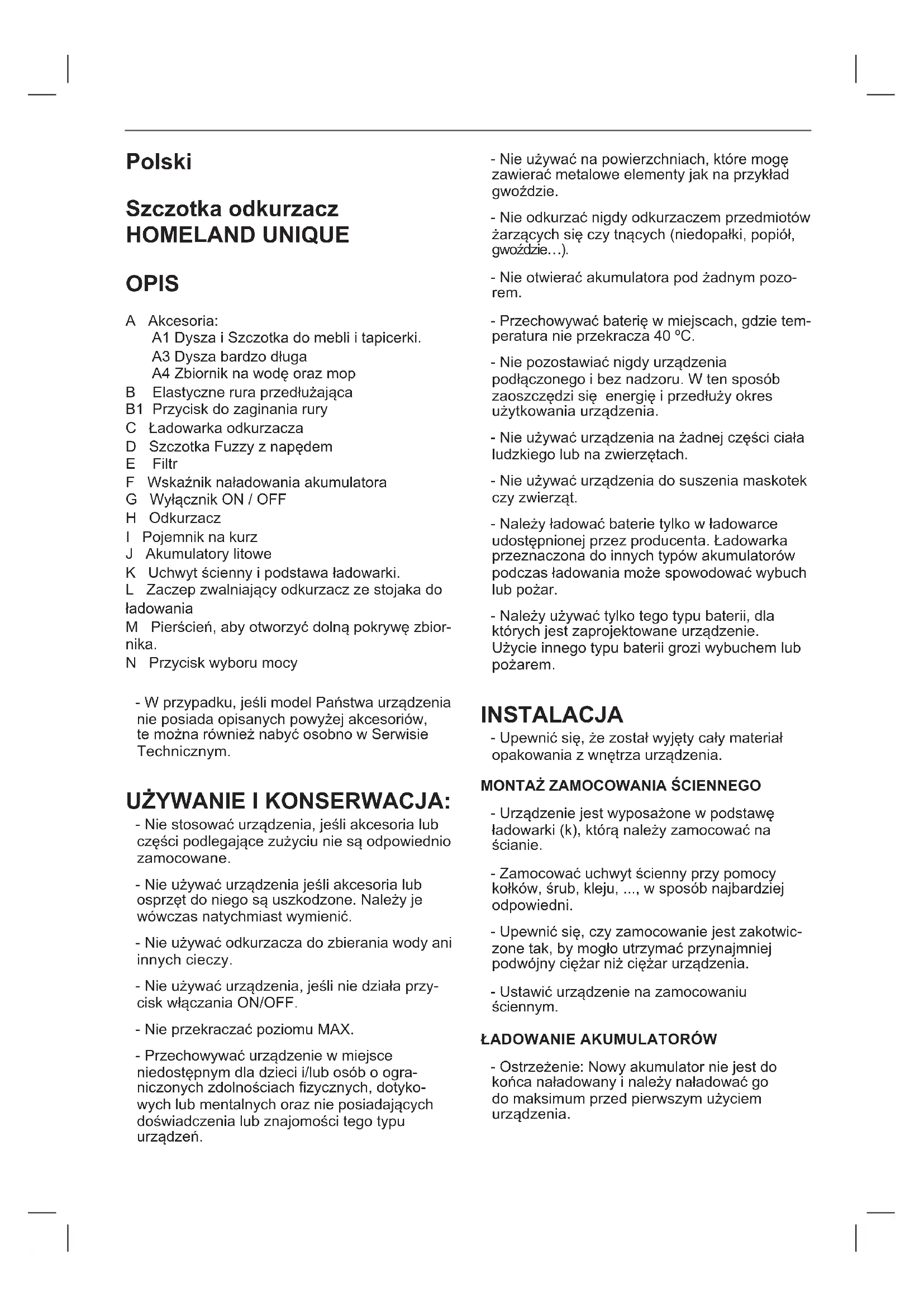 VERWIJDEREN: - Verwijder de bovenkant van de behuizing van het apparaat, een onderdeel boven de handgreep, om de behuizing te verwijderen moet men kracht uitoefenen op het lagere deel om de lipjes waarmee zij vastzit los te klikken. (Fig. 7). - Identiceer de batterij en knip de 4 kabels die met de batterij verbonden zijn door. Om het risico van kortsluiting te voorkomen, scherm de geleders af met isolatieband. (Fig.8) - Verwijder de batterij voorzichtig.Polski Szczotka odkurzacz HOMELAND UNIQUE OPIS A Akcesoria: A1 Dysza i Szczotka do mebli i tapicerki. A3 Dysza bardzo długa A4 Zbiornik na wodę oraz mop B Elastyczne rura przedłużająca B1 Przycisk do zaginania rury C Ładowarka odkurzacza D Szczotka Fuzzy z napędem E Filtr F Wskaźnik naładowania akumulatora G Wyłącznik ON / OFF H Odkurzacz I Pojemnik na kurz J Akumulatory litowe K Uchwyt ścienny i podstawa ładowarki. L Zaczep zwalniający odkurzacz ze stojaka do ładowania M Pierścień, aby otworzyć dolną pokrywę zbior- nika. N Przycisk wyboru mocy - W przypadku, jeśli model Państwa urządzenia nie posiada opisanych powyżej akcesoriów, te można również nabyć osobno w Serwisie Technicznym. UŻYWANIE I KONSERWACJA: - Nie stosować urządzenia, jeśli akcesoria lub części podlegające zużyciu nie są odpowiednio zamocowane. - Nie używać urządzenia jeśli akcesoria lub osprzęt do niego są uszkodzone. Należy je wówczas natychmiast wymienić. - Nie używać odkurzacza do zbierania wody ani innych cieczy. - Nie używać urządzenia, jeśli nie działa przy- cisk włączania ON/OFF. - Nie przekraczać poziomu MAX. - Przechowywać urządzenie w miejsce niedostępnym dla dzieci i/lub osób o ogra- niczonych zdolnościach zycznych, dotyko- wych lub mentalnych oraz nie posiadających doświadczenia lub znajomości tego typu urządzeń. - Nie używać na powierzchniach, które mogę zawierać metalowe elementy jak na przykład gwoździe. - Nie odkurzać nigdy odkurzaczem przedmiotów żarzących się czy tnących (niedopałki, popiół, gwoździe…). - Nie otwierać akumulatora pod żadnym pozo- rem. - Przechowywać baterię w miejscach, gdzie tem- peratura nie przekracza 40 ºC. - Nie pozostawiać nigdy urządzenia podłączonego i bez nadzoru. W ten sposób zaoszczędzi się energię i przedłuży okres użytkowania urządzenia. - Nie używać urządzenia na żadnej części ciała ludzkiego lub na zwierzętach. - Nie używać urządzenia do suszenia maskotek czy zwierząt. - Należy ładować baterie tylko w ładowarce udostępnionej przez producenta. Ładowarka przeznaczona do innych typów akumulatorów podczas ładowania może spowodować wybuch lub pożar. - Należy używać tylko tego typu baterii, dla których jest zaprojektowane urządzenie. Użycie innego typu baterii grozi wybuchem lub pożarem. INSTALACJA - Upewnić się, że został wyjęty cały materiał opakowania z wnętrza urządzenia.