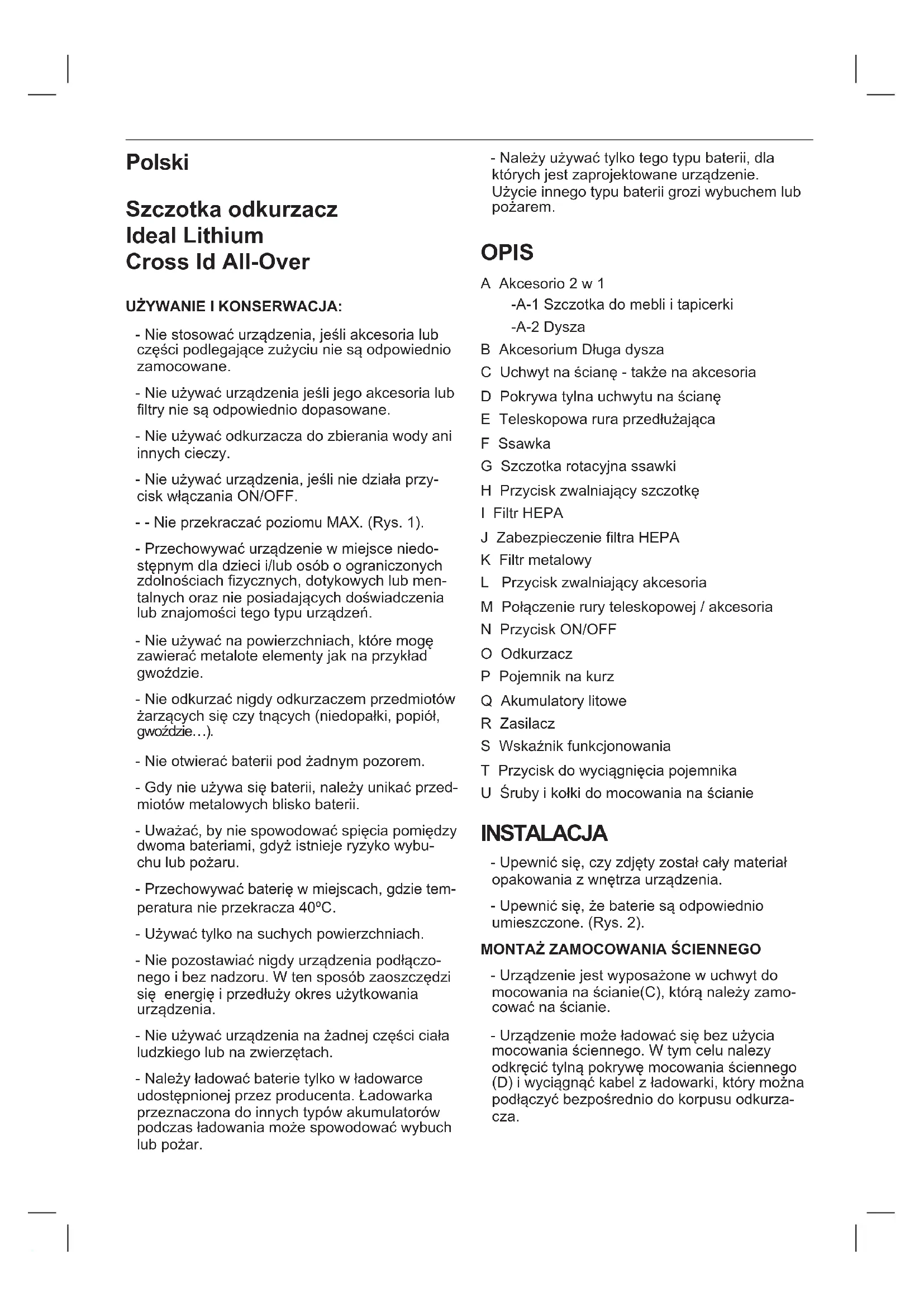 VERWIJDEREN: - Trek de batterij naar boven om haar uit het batterijvak te verwijderen. (Fig. 11).Polski Szczotka odkurzacz Ideal Lithium Cross Id All-Over UŻYWANIE I KONSERWACJA: - Nie stosować urządzenia, jeśli akcesoria lub części podlegające zużyciu nie są odpowiednio zamocowane. - Nie używać urządzenia jeśli jego akcesoria lub ltry nie są odpowiednio dopasowane. - Nie używać odkurzacza do zbierania wody ani innych cieczy. - Nie używać urządzenia, jeśli nie działa przy- cisk włączania ON/OFF. - - Nie przekraczać poziomu MAX. (Rys. 1). - Przechowywać urządzenie w miejsce niedo- stępnym dla dzieci i/lub osób o ograniczonych zdolnościach zycznych, dotykowych lub men- talnych oraz nie posiadających doświadczenia lub znajomości tego typu urządzeń. - Nie używać na powierzchniach, które mogę zawierać metalote elementy jak na przykład gwoździe. - Nie odkurzać nigdy odkurzaczem przedmiotów żarzących się czy tnących (niedopałki, popiół, gwoździe…). - Nie otwierać baterii pod żadnym pozorem. - Gdy nie używa się baterii, należy unikać przed- miotów metalowych blisko baterii. - Uważać, by nie spowodować spięcia pomiędzy dwoma bateriami, gdyż istnieje ryzyko wybu- chu lub pożaru. - Przechowywać baterię w miejscach, gdzie tem- peratura nie przekracza 40ºC. - Używać tylko na suchych powierzchniach. - Nie pozostawiać nigdy urządzenia podłączo- nego i bez nadzoru. W ten sposób zaoszczędzi się energię i przedłuży okres użytkowania urządzenia. - Nie używać urządzenia na żadnej części ciała ludzkiego lub na zwierzętach. - Należy ładować baterie tylko w ładowarce udostępnionej przez producenta. Ładowarka przeznaczona do innych typów akumulatorów podczas ładowania może spowodować wybuch lub pożar. - Należy używać tylko tego typu baterii, dla których jest zaprojektowane urządzenie. Użycie innego typu baterii grozi wybuchem lub pożarem. OPIS A Akcesorio 2 w 1 -A-1 Szczotka do mebli i tapicerki -A-2 Dysza B Akcesorium Długa dysza C Uchwyt na ścianę - także na akcesoria D Pokrywa tylna uchwytu na ścianę E Teleskopowa rura przedłużająca F Ssawka G Szczotka rotacyjna ssawki H Przycisk zwalniający szczotkę I Filtr HEPA J Zabezpieczenie ltra HEPA K Filtr metalowy L Przycisk zwalniający akcesoria M Połączenie rury teleskopowej / akcesoria N Przycisk ON/OFF O Odkurzacz P Pojemnik na kurz Q Akumulatory litowe R Zasilacz S Wskaźnik funkcjonowania T Przycisk do wyciągnięcia pojemnika U Śruby i kołki do mocowania na ścianie INSTALACJA - Upewnić się, czy zdjęty został cały materiał opakowania z wnętrza urządzenia. - Upewnić się, że baterie są odpowiednio umieszczone. (Rys. 2).