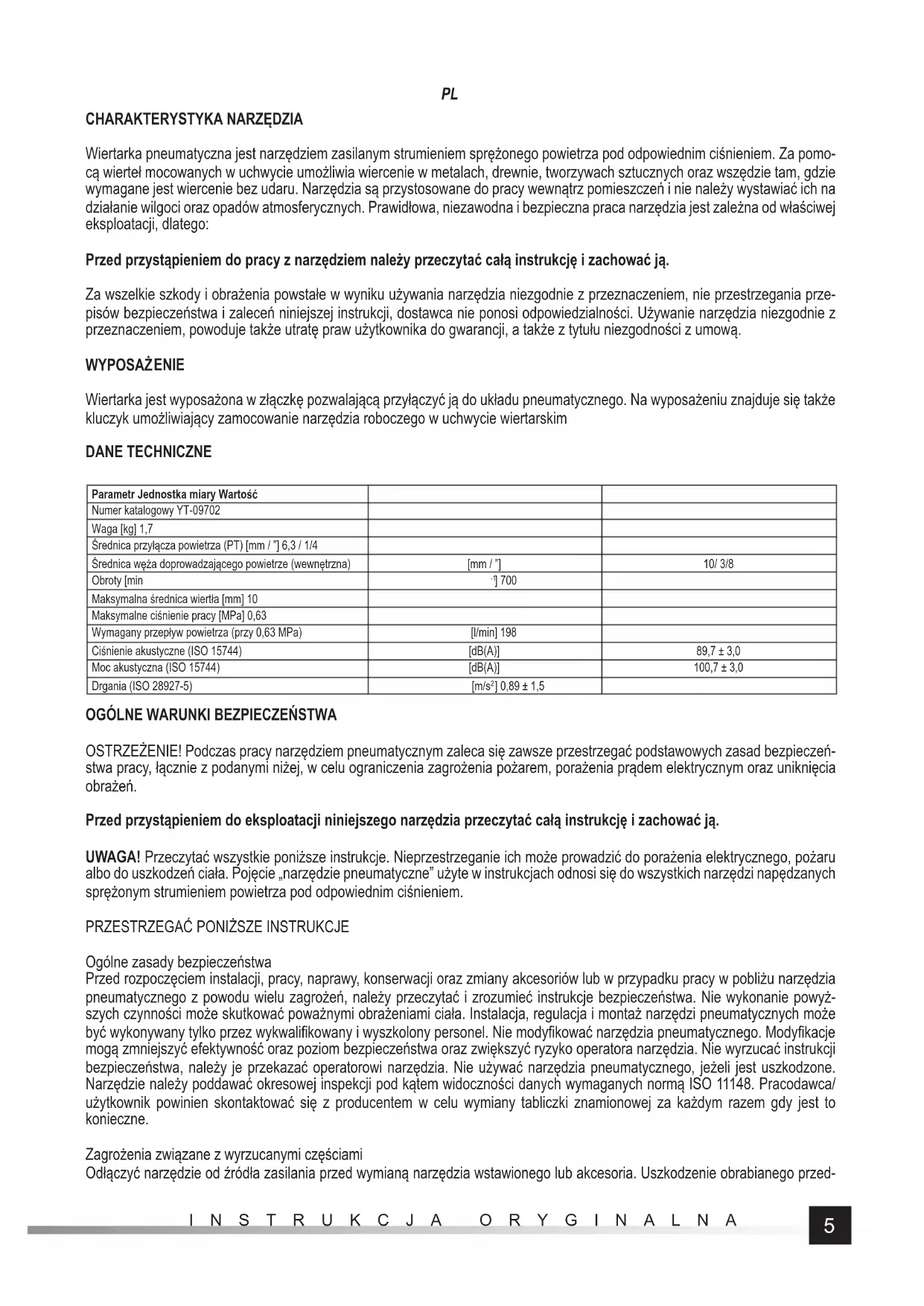 Wiertarka pneumatyczna jest narzędziem zasilanym strumieniem sprężonego powietrza pod odpowiednim ciśnieniem. Za pomo- cą wierteł mocowanych w uchwycie umożliwia wiercenie w metalach, drewnie, tworzywach sztucznych oraz wszędzie tam, gdzie wymagane jest wiercenie bez udaru. Narzędzia są przystosowane do pracy wewnątrz pomieszczeń i nie należy wystawiać ich na działanie wilgoci oraz opadów atmosferycznych. Prawidłowa, niezawodna i bezpieczna praca narzędzia jest zależna od właściwej eksploatacji, dlatego: Przed przystąpieniem do pracy z narzędziem należy przeczytać całą instrukcję i zachować ją. Za wszelkie szkody i obrażenia powstałe w wyniku używania narzędzia niezgodnie z przeznaczeniem, nie przestrzegania prze- pisów bezpieczeństwa i zaleceń niniejszej instrukcji, dostawca nie ponosi odpowiedzialności. Używanie narzędzia niezgodnie z przeznaczeniem, powoduje także utratę praw użytkownika do gwarancji, a także z tytułu niezgodności z umową. WYPOSAŻ ENIE Wiertarka jest wyposażona w złączkę pozwalającą przyłączyć ją do układu pneumatycznego. Na wyposażeniu znajduje się także kluczyk umożliwiający zamocowanie narzędzia roboczego w uchwycie wiertarskim DANE TECHNICZNE Parametr Jednostka miary Wartość Numer katalogowy YT-09702 Waga [kg] 1,7 Średnica przyłącza powietrza (PT) [mm / ”] 6,3 / 1/4 Średnica węża doprowadzającego powietrze (wewnętrzna) [mm / ”] 10/ 3/8 Obroty [min