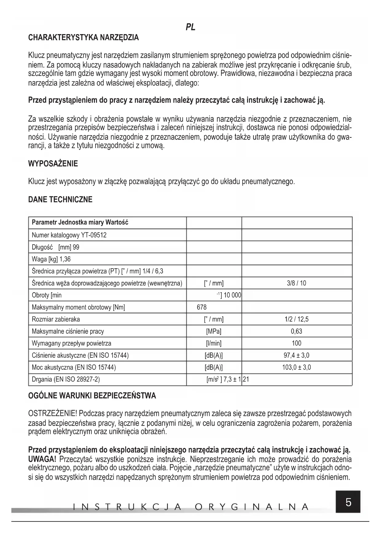 Klucz pneumatyczny jest narzędziem zasilanym strumieniem sprężonego powietrza pod odpowiednim ciśnie- niem. Za pomocą kluczy nasadowych nakładanych na zabierak możliwe jest przykręcanie i odkręcanie śrub, szczególnie tam gdzie wymagany jest wysoki moment obrotowy. Prawidłowa, niezawodna i bezpieczna praca narzędzia jest zależna od właściwej eksploatacji, dlatego: Przed przystąpieniem do pracy z narzędziem należy przeczytać całą instrukcję i zachować ją. Za wszelkie szkody i obrażenia powstałe w wyniku używania narzędzia niezgodnie z przeznaczeniem, nie przestrzegania przepisów bezpieczeństwa i zaleceń niniejszej instrukcji, dostawca nie ponosi odpowiedzial- ności. Używanie narzędzia niezgodnie z przeznaczeniem, powoduje także utratę praw użytkownika do gwa- rancji, a także z tytułu niezgodności z umową. WYPOSAŻENIE Klucz jest wyposażony w złączkę pozwalającą przyłączyć go do układu pneumatycznego. DANE TECHNICZNE Parametr Jednostka miary Wartość Numer katalogowy YT-09512 Długość [mm] 99 Waga [kg] 1,36 Średnica przyłącza powietrza (PT) [” / mm] 1/4 / 6,3 Średnica węża doprowadzającego powietrze (wewnętrzna) [” / mm] 3/8 / 10 Obroty [min