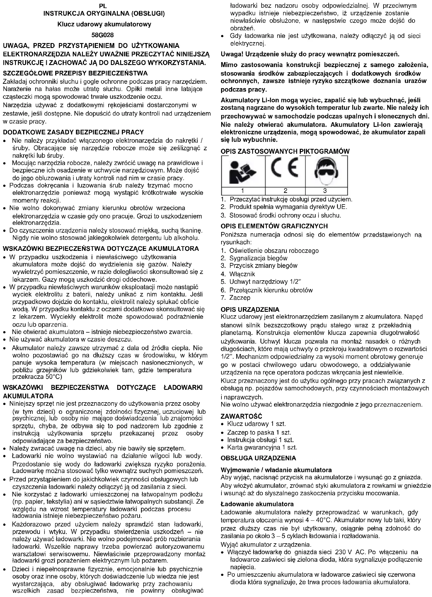 INSTRUKCJA ORYGINALNA (OBSŁUGI) Klucz udarowy akumulatorowy 58G028 UWAGA, PRZED PRZYSTĄPIENIEM DO UŻYTKOWANIA ELEKTRONARZĘDZIA NALEŻY UWAŻNIE PRZECZYTAĆ NINIEJSZĄ INSTRUKCJĘ I ZACHOWAĆ JĄ DO DALSZEGO WYKORZYSTANIA.