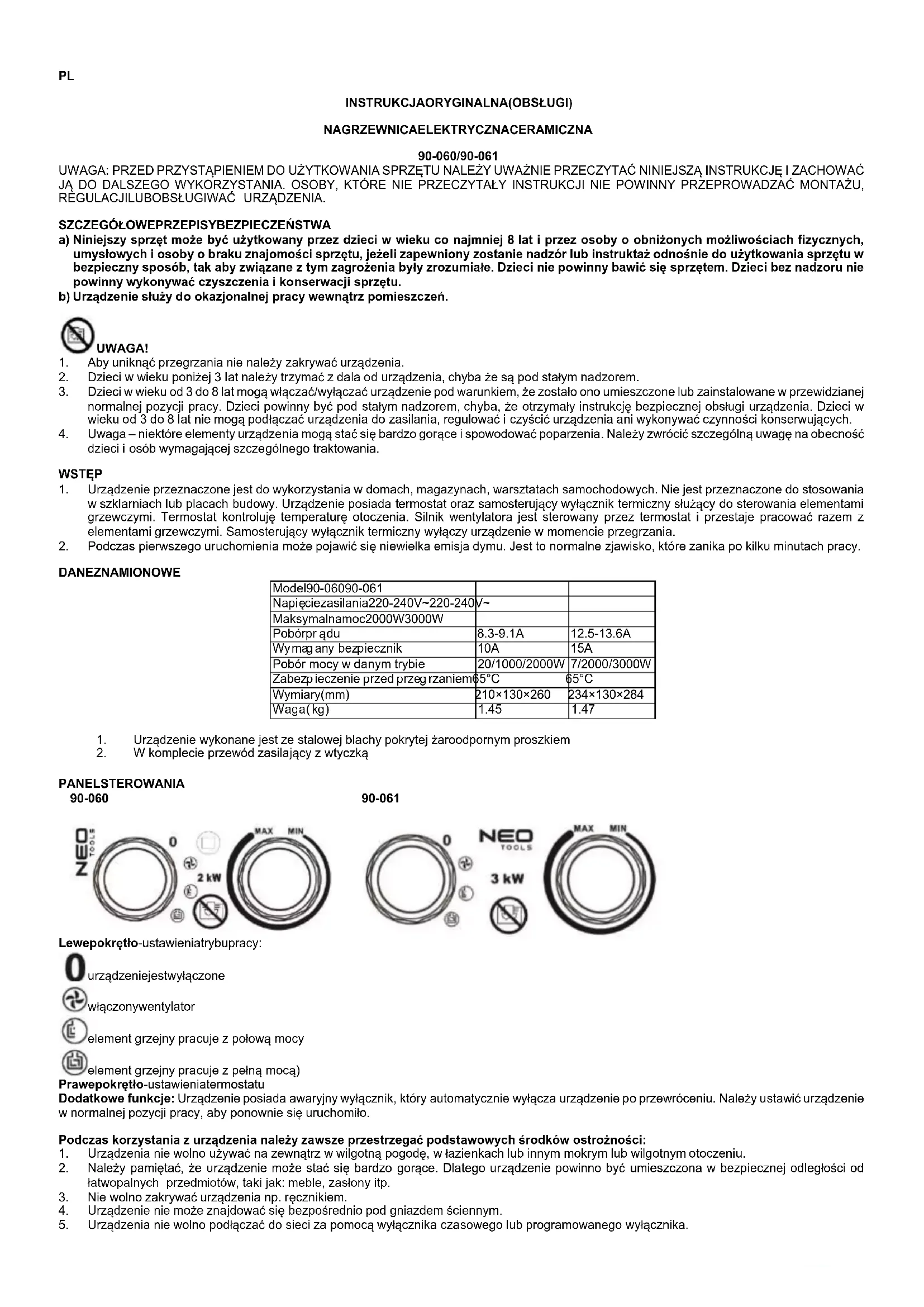 PANEL STEROWANIA 90-060 90-061 Lewe pokrętło - ustawienia trybu pracy: urządzenie jest wyłączone włączony wentylator element grzejny pracuje z połową mocy element grzejny pracuje z pełną mocą) Prawe pokrętło - ustawienia termostatu Dodatkowe funkcje: Urządzenie posiada awaryjny wyłącznik, który automatycznie wyłącza urządzenie po prze wróceniu. Należy ustawić urządzenie w normalnej pozycji pracy, aby ponownie się uru chomiło. Podczas korzystania z urządzenia należy zawsze przestrzegać podstawowych środków ostrożności: