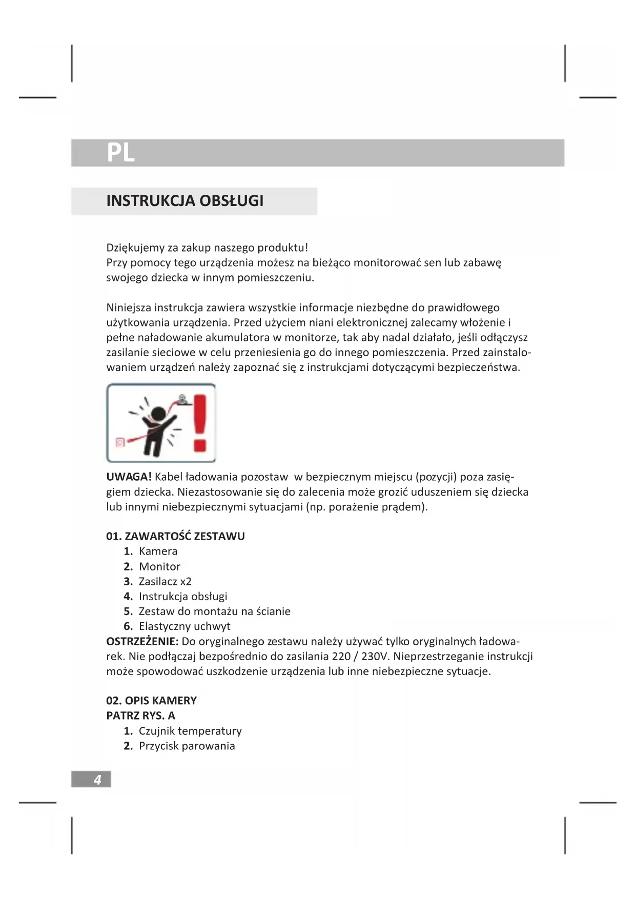 Dziękujemy za zakup naszego produktu! Przy pomocy tego urządzenia możesz na bieżąco monitorować sen lub zabawę swojego dziecka w innym pomieszczeniu. Niniejsza instrukcja zawiera wszystkie informacje niezbędne do prawidłowego użytkowania urządzenia. Przed użyciem niani elektronicznej zalecamy włożenie i pełne naładowanie akumulatora w monitorze, tak aby nadal działało, jeśli odłączysz zasilanie sieciowe w celu przeniesienia go do innego pomieszczenia. Przed zainstalo- waniem urządzeń należy zapoznać się z instrukcjami dotyczącymi bezpieczeństwa. UWAGA! Kabel ładowania pozostaw w bezpiecznym miejscu (pozycji) poza zasię- giem dziecka. Niezastosowanie się do zalecenia może grozić uduszeniem się dziecka lub innymi niebezpiecznymi sytuacjami (np. porażenie prądem).