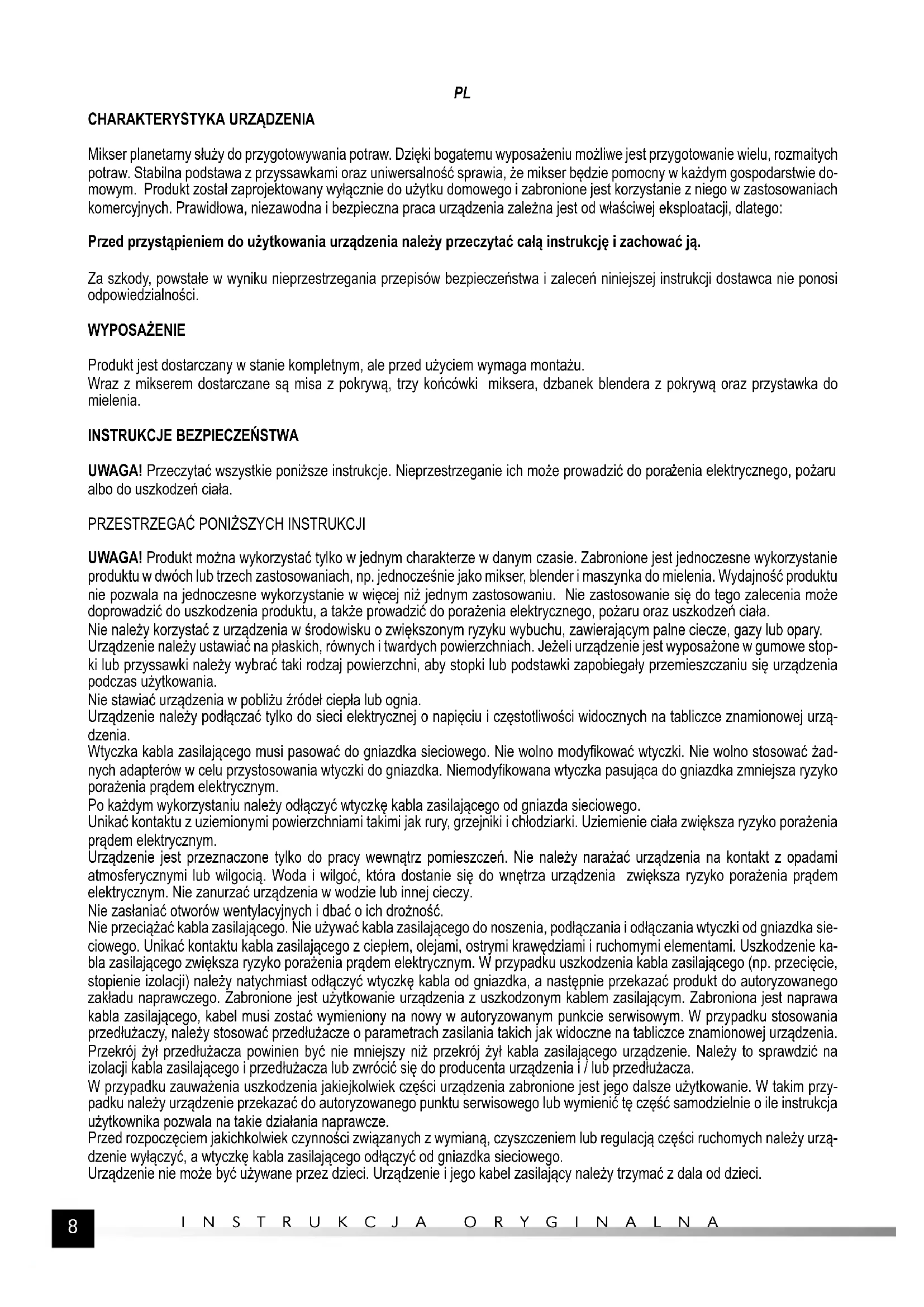 UWAGA! Produkt można wykorzystać tylko w jednym charakterze w danym czasie. Zabronione jest jednoczesne wykorzystanie produktu w dwóch lub trzech zastosowaniach, np. jednocześnie jako mikser, blender i maszynka do mielenia. Wydajność produktu nie pozwala na jednoczesne wykorzystanie w więcej niż jednym zastosowaniu. Nie zastosowanie się do tego zalecenia może doprowadzić do uszkodzenia produktu, a także prowadzić do porażenia elektrycznego, pożaru oraz uszkodzeń ciała. Nie należy korzystać z urządzenia w środowisku o zwiększonym ryzyku wybuchu, zawierającym palne ciecze, gazy lub opary. Urządzenie należy ustawiać na płaskich, równych i twardych powierzchniach. Jeżeli urządzenie jest wyposażone w gumowe stop- ki lub przyssawki należy wybrać taki rodzaj powierzchni, aby stopki lub podstawki zapobiegały przemieszczaniu się urządzenia podczas użytkowania. Nie stawiać urządzenia w pobliżu źródeł ciepła lub ognia. Urządzenie należy podłączać tylko do sieci elektrycznej o napięciu i częstotliwości widocznych na tabliczce znamionowej urzą- dzenia. Wtyczka kabla zasilającego musi pasować do gniazdka sieciowego. Nie wolno modyfikować wtyczki. Nie wolno stosować żad- nych adapterów w celu przystosowania wtyczki do gniazdka. Niemodyfikowana wtyczka pasująca do gniazdka zmniejsza ryzyko porażenia prądem elektrycznym. Po każdym wykorzystaniu należy odłączyć wtyczkę kabla zasilającego od gniazda sieciowego. Unikać kontaktu z uziemionymi powierzchniami takimi jak rury, grzejniki i chłodziarki. Uziemienie ciała zwiększa ryzyko porażenia prądem elektrycznym. Urządzenie jest przeznaczone tylko do pracy wewnątrz pomieszczeń. Nie należy narażać urządzenia na kontakt z opadami atmosferycznymi lub wilgocią. Woda i wilgoć, która dostanie się do wnętrza urządzenia zwiększa ryzyko porażenia prądem elektrycznym. Nie zanurzać urządzenia w wodzie lub innej cieczy. Nie zasłaniać otworów wentylacyjnych i dbać o ich drożność. Nie przeciążać kabla zasilającego. Nie używać kabla zasilającego do noszenia, podłączania i odłączania wtyczki od gniazdka sie- ciowego. Unikać kontaktu kabla zasilającego z ciepłem, olejami, ostrymi krawędziami i ruchomymi elementami. Uszkodzenie ka- bla zasilającego zwiększa ryzyko porażenia prądem elektrycznym. W przypadku uszkodzenia kabla zasilającego (np. przecięcie, stopienie izolacji) należy natychmiast odłączyć wtyczkę kabla od gniazdka, a następnie przekazać produkt do autoryzowanego zakładu naprawczego. Zabronione jest użytkowanie urządzenia z uszkodzonym kablem zasilającym. Zabroniona jest naprawa kabla zasilającego, kabel musi zostać wymieniony na nowy w autoryzowanym punkcie serwisowym. W przypadku stosowania przedłużaczy, należy stosować przedłużacze o parametrach zasilania takich jak widoczne na tabliczce znamionowej urządzenia. Przekrój żył przedłużacza powinien być nie mniejszy niż przekrój żył kabla zasilającego urządzenie. Należy to sprawdzić na izolacji kabla zasilającego i przedłużacza lub zwrócić się do producenta urządzenia i / lub przedłużacza. W przypadku zauważenia uszkodzenia jakiejkolwiek części urządzenia zabronione jest jego dalsze użytkowanie. W takim przy- padku należy urządzenie przekazać do autoryzowanego punktu serwisowego lub wymienić tę część samodzielnie o ile instrukcja użytkownika pozwala na takie działania naprawcze. Przed rozpoczęciem jakichkolwiek czynności związanych z wymianą, czyszczeniem lub regulacją części ruchomych należy urzą- dzenie wyłączyć, a wtyczkę kabla zasilającego odłączyć od gniazdka sieciowego. Urządzenie nie może być używane przez dzieci. Urz ądzenie i jego kabel zasilający należy trzymać z dala od dzieci.INSTRUKCJA ORYGINALNA