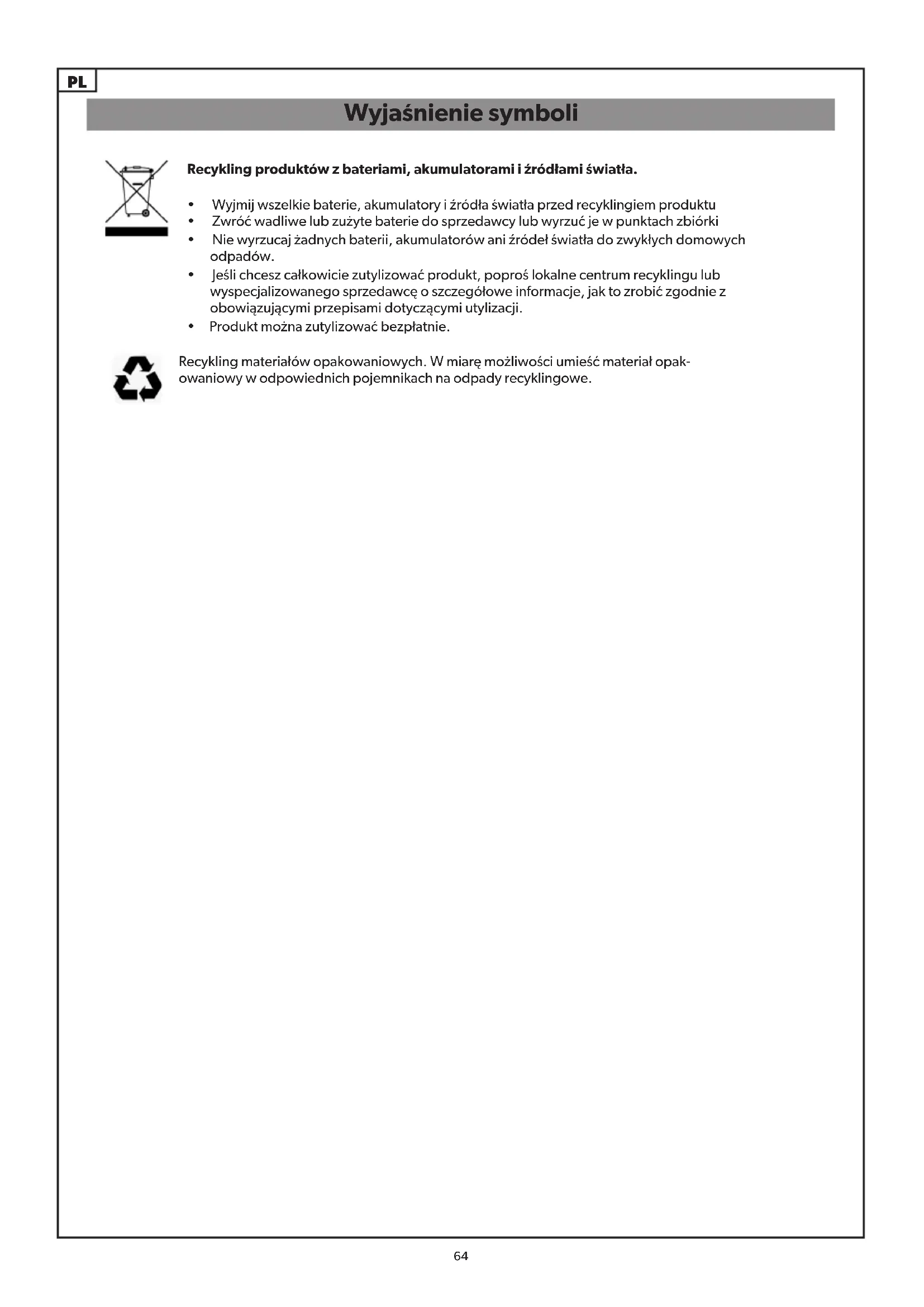 - Nie wyrzucaj żadnych baterii, akumulatorów ani źródeł światła do zwykłych domowych odpadów.