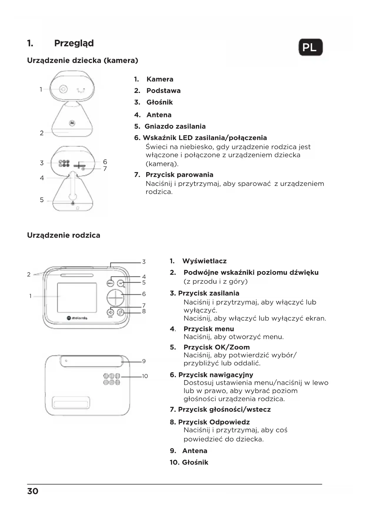 włączyć lub wyłączyć. Nacisnij i przytrzymaj Uwaga Używaj tylko dostarczonego zasilacza (DC5V / 1000 mA). Sparuj urządzenie dziecka (kamerę) z urządzeniem rodzica Sparowaliśmy urządzenie dziecka z urządzeniem rodzica w zestawie. Jeśli chcesz sparować dodatkową kamerę, naciśnij i przytrzymaj z tyłu urządzenia dziecka (kamery), aż dioda LED zacznie migać.32