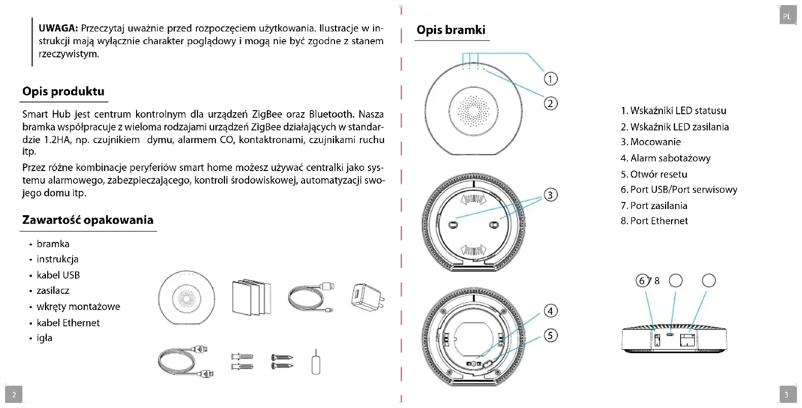 UWAGA: Przeczytaj uważnie przed rozpoczęciem użytkowania. Ilustracje w in- strukcji mają wyłącznie charakter poglądowy i mogą nie być zgodne z stanem rzeczywistym. Opis produktu Smart Hub jest centrum kontrolnym dla urządzeń ZigBee oraz Bluetooth. Nasza bramka współpracuje z wieloma rodzajami urządzeń ZigBee działających w standar- dzie 1.2HA, np. czujnikiem dymu, alarmem CO, kontaktronami, czujnikami ruchu itp. Przez różne kombinacje peryferiów smart home możesz używać centralki jako sys- temu alarmowego, zabezpieczającego, kontroli środowiskowej, automatyzacji swo- jego domu itp. Zawartość opakowania