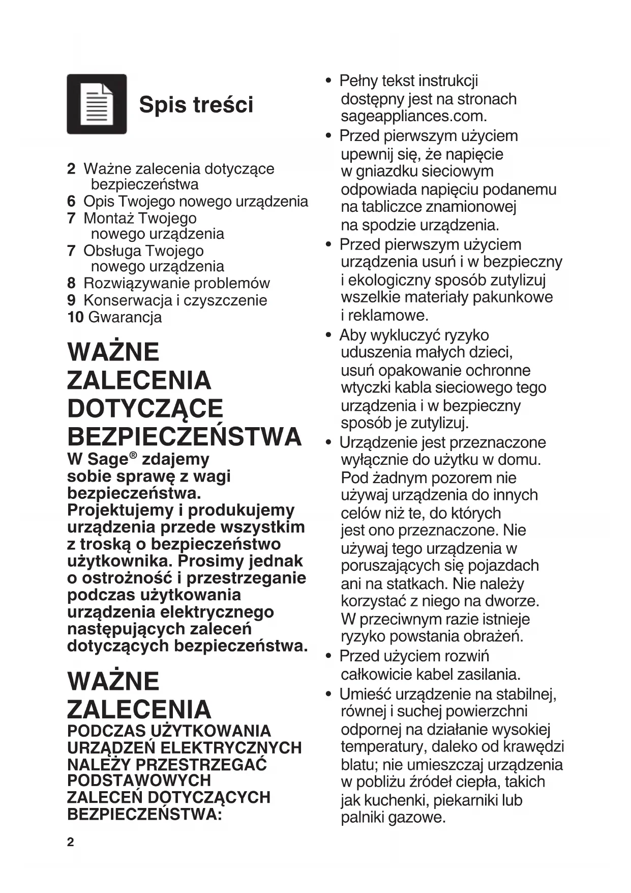 - Pełny tekst instrukcji dostępny jest na stronach sageappliances.com.