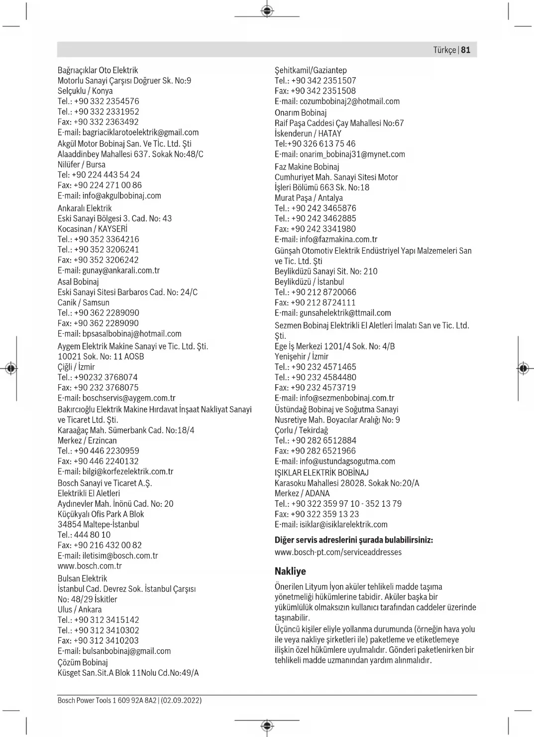 Karasoku Mahallesi 28028. Sokak No:20/A Merkez / ADANA Tel.: +903223599710 -3521379 Fax: +903223591323 E-mail: isiklar@isiklarelektrik.com Diğer servis adreslerini şurada bulabilirsiniz: www.bosch-pt.com/serviceaddresses Nakliye Önerilen Lityum İyon aküler tehlikeli madde taşıma yönetmeliği hükümlerine tabidir. Aküler başka bir yükümlülük olmaksızın kullanıcı tarafından caddeler üzerinde taşınabilir. Üçüncü kişiler eliyle yollanma durumunda (örneğin hava yolu ile veya nakliye şirketleri ile) paketleme ve etiketlemeye ilişkin özel hükümlere uyulmalıdır. Gönderi paketlenirken bir tehlikeli madde uzmanından yardım alınmalıdır. Bosch Power Tools 1 609 92A 8A2 | (02.09.2022)82 | Polski Aküleri sadece ve ancak gövdelerinde hasar yoksa gönderin. Açık kontakları kapatın ve aküyü ambalaj içinde hareket etmeyecek biçimde paketleyin. Lütfen olası ek ulusal yönetmelik hükümlerine de uyun. Tasfiye Elektrikli el aletleri, aküler, aksesuar ve ambalaj malzemesi çevre dostu tasfiye amacıyla bir geri dönüşüm merkezine yollanmalıdır. Elektrikli el aletlerini ve aküleri/bataryaları evsel çöplerin içine atmayın! Sadece AB ülkeleri için: Atık elektrikli ve elektronik cihazlara ilişkin 2012/19/EU sayılı Avrupa yönetmeliği ve ulusal hukuktaki uygulaması uyarınca, kullanım ömrünü tamamlamış elektrikli el aletleri ve 2006/66/EC sayılı Avrupa yönetmeliği uyarınca arızalı veya kullanım ömrünü tamamlamış aküler/piller ayrı ayrı toplanmalı ve çevre kurallarına uygun şekilde imha edilmek üzere bir geri dönüşüm merkezine gönderilmelidir. Atık elektrikli ve elektronik ekipmanlar uygun şekilde imha edilmezse olası tehlikeli maddelerin varlığı nedeniyle çevre ve insan sağlığı üzerinde zararlı etkileri olabilir. Aküler/bataryalar: Lityum iyon: Lütfen nakliye bölümündeki talimata uyun (Bakınız „Nakliye“, Sayfa81). Polski Wskazówki bezpieczeństwa Ogólne wskazówki bezpieczeństwa dotyczące pracy z elektronarzędziami OSTRZEŻENIE Należy zapoznać się ze wszystkimi ostrzeżeniami i wskazówkami do- tyczącymi bezpieczeństwa użytkowania oraz ilustracjami i danymi technicznymi, dostarczonymi wraz z niniejszym elektronarzędziem. Nieprzestrzeganie poniższych wskazó- wek może stać się przyczyną porażenia prądem elektrycz- nym, pożaru i/lub poważnych obrażeń ciała. Należy zachować wszystkie przepisy i wskazówki bezpie- czeństwa dla dalszego zastosowania. Pojęcie "elektronarzędzie" odnosi się do elektronarzędzi za- silanych energią elektryczną z sieci (z przewodem zasilają- cym) i do elektronarzędzi zasilanych akumulatorami (bezprzewodu zasilającego). Bezpieczeństwo w miejscu pracy u Miejsce pracy należy utrzymywać w czystości i zapew- nić dobre oświetlenie. Nieporządek i brak właściwego oświetlenia sprzyjają wypadkom. u Elektronarzędzi nie należy używać w środowiskach za- grożonym wybuchem, np. w pobliżu łatwopalnych cie- czy, gazów lub pyłów. Podczas pracy elektronarzędziem wytwarzają się iskry, które mogą spowodować zapłon py- łów lub oparów. u Podczas użytkowania urządzenia należy zwrócić uwa- gę na to, aby dzieci i inne osoby postronne znajdowały się w bezpiecznej odległości. Czynniki rozpraszające mogą spowodować utratę panowania nad elektronarzę- dziem. Bezpieczeństwo elektryczne u Wtyczki elektronarzędzi muszą pasować do gniazd. Nie wolno w żadnej sytuacji i w żaden sposób modyfi- kować wtyczek. Podczas pracy elektronarzędziami z uziemieniem ochronnym nie wolno stosować żadnych wtyków adaptacyjnych. Oryginalne wtyczki i pasujące do nich gniazda sieciowe zmniejszają ryzyko porażenia prądem. u Należy unikać kontaktu z uziemionymi elementami lub zwartymi z masą, takimi jak rury, grzejniki, kuchenki ilodówki. Uziemienie ciała zwiększa ryzyko porażenia prądem elektrycznym. u Elektronarzędzi nie wolno narażać na kontakt z desz- czem ani wilgocią. Przedostanie się wody do wnętrza obudowy zwiększa ryzyko porażenia prądem elektrycz- nym. u Nie używać przewodu zasilającego do innych celów. Nie wolno używać przewodu do przenoszenia ani prze- suwania elektronarzędzia; nie wolno też wyjmować wtyczki z gniazda, pociągając za przewód. Przewód należy chronić przed wysokimi temperaturami, należy go trzymać zdala od oleju, ostrych krawędzi i rucho- mych części urządzenia. Uszkodzone lub splątane prze- wody zwiększają ryzyko porażenia prądem elektrycznym. u Używając elektronarzędzia na świeżym powietrzu, na- leży upewnić się, że przedłużacz jest przeznaczony do pracy na zewnątrz. Użycie przedłużacza przeznaczone- go do pracy na zewnątrz zmniejsza ryzyko porażenia prą- dem elektrycznym. u Jeżeli nie ma innej możliwości, niż użycie elektrona- rzędzia w wilgotnym otoczeniu, należy podłączyć je do źródła zasilania wyposażonego w wyłącznik ochronny różnicowoprądowy. Zastosowanie wyłącznika ochron- nego różnicowoprądowego zmniejsza ryzyko porażenia prądem elektrycznym. Bezpieczeństwo osób u Podczas pracy z elektronarzędziem należy zachować czujność, każdą czynność wykonywać ostrożnie i z rozwagą. Nie przystępować do pracy elektronarzę- dziem w stanie zmęczenia lub będąc pod wpływem narkotyków, alkoholu lub leków. Chwila nieuwagi pod- 1 609 92A 8A2 | (02.09.2022) Bosch Power ToolsPolski | 83 czas pracy może grozić bardzo poważnymi obrażeniami ciała. u Stosować środki ochrony osobistej. Należy zawsze nosić okulary ochronne. Środki ochrony osobistej, np. maska przeciwpyłowa, antypoślizgowe obuwie, kask ochronny czy ochraniacze na uszy, w określonych warun- kach pracy obniżają ryzyko obrażeń ciała. u Należy unikać niezamierzonego uruchomienia narzę- dzia. Przed podłączeniem elektronarzędzia do źródła zasilania i/lub podłączeniem akumulatora, podniesie- niem albo transportem urządz
