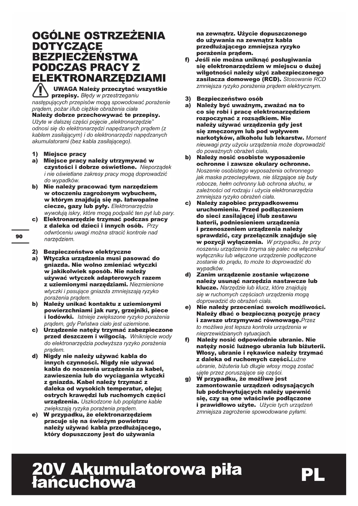 20V Akumulatorowa piła łańcuchowa SYMBOLE Aby zmniejszyć niebezpieczeństwo odniesienia obrażeń, użytkownik powinien przeczytać podręcznik z instrukcjami.OSTRZEŻENIEUżywać ochrony słuchu.Używać ochrony wzroku.Stosować ochronę głowyNależy zakładać okulary ochronneObuwie ochronneChroń narzędzie przed deszczemOstrzeżenie odnośnie niebezpieczeństwa wynikającego z naziemnych linii elektrycznych.Odpady wyrobów elektrycznych nie powinny być wyrzucane razem z odpadami gospodarstwa domowego. Należy korzystać z recyklingu, jeśli istnieje odpowiednia infrastruktura. Porady dotyczące recyklingu można uzyskać u władz lokalnych lub sprzedawcy detalicznego.Bateria litowo-jonowa. Ten produkt oznaczono symbolem „segregacji odpadów” dla zużytych baterii i akumulatorów. Umożliwia to jego recycling i demontaż, które zmniejszają negatywny wpływ na środowisko. Pakiety akumulatorów są niebezpieczne dla środowiska i dla ludzkiego życia, gdyż zawierają niebezpieczne substancje.Nie wrzucać do ogniaNieprawidłowo utylizowane baterie mogą dostać się do obiegu wodnego, co jest groźne dla ekosystemu. Nie wyrzucaj baterii wraz z niesortowanymi odpadami miejskimi.Odblokowanie Blokada`