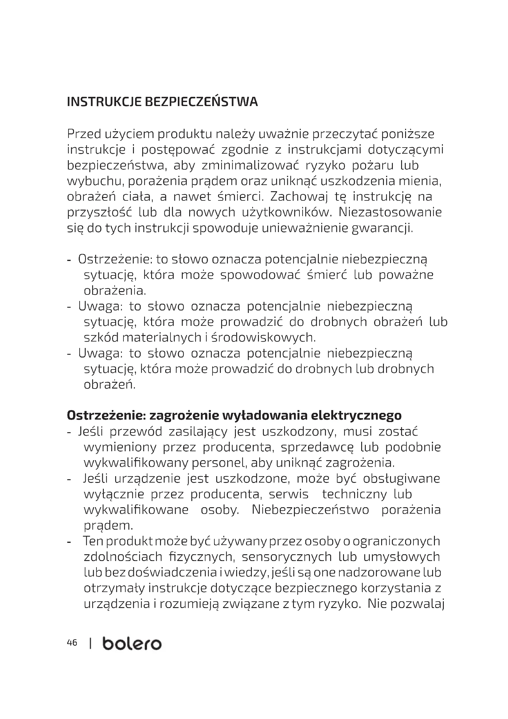 Przed użyciem produktu należy uważnie przeczytać poniższe instrukcje i postępować zgodnie z instrukcjami dotyczącymi bezpieczeństwa, aby zminimalizować ryzyko pożaru lub wybuchu, porażenia prądem oraz uniknąć uszkodzenia mienia, obrażeń ciała, a nawet śmierci. Zachowaj tę instrukcję na przyszłość lub dla nowych użytkowników. Niezastosowanie się do tych instrukcji spowoduje unieważnienie gwarancji. - Ostrzeżenie: to słowo oznacza potencjalnie niebezpieczną sytuację, która może spowodować śmierć lub poważne obrażenia. - Uwaga: to słowo oznacza potencjalnie niebezpieczną sytuację, która może prowadzić do drobnych obrażeń lub szkód materialnych i środowiskowych. - Uwaga: to słowo oznacza potencjalnie niebezpieczną sytuację, która może prowadzić do drobnych lub drobnych obrażeń. Ostrzeżenie: zagrożenie wyładowania elektrycznego - Jeśli przewód zasilający jest uszkodzony, musi zostać wymieniony przez producenta, sprzedawcę lub podobnie wykwalikowany personel, aby uniknąć zagrożenia. - Jeśli urządzenie jest uszkodzone, może być obsługiwane wyłącznie przez producenta, serwis techniczny lub wykwalikowane osoby. Niebezpieczeństwo porażenia prądem. - Ten produkt może być używany przez osoby o ograniczonych zdolnościach zycznych, sensorycznych lub umysłowych lub bez doświadczenia i wiedzy, jeśli są one nadzorowane lub otrzymały instrukcje dotyczące bezpiecznego korzystania z urządzenia i rozumieją związane z tym ryzyko. Nie pozwalaj 02380_Bolero DressCode Top 80 Inverter_Manual_YV_01220209.indd 4602380_Bolero DressCode Top 80 Inverter_Manual_YV_01220209.indd 46 10/2/22 9:4310/2/22 9:4347