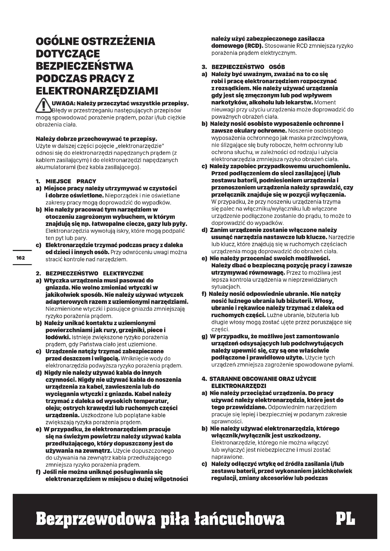 Należy odłączyć wtykę od źródła zasilania i/lub zestawu baterii, przed wykonaniem jakichkolwiek regulacji, zmiany akcesoriów lub podczas163 %H]SU]HZRGRZDSLãDãDńcuchowa PL przechowywania elektronarzędzi. Ten środek ostrożności zapobiega niezamierzonemu włączeniu się urządzenia. d) Nie używane elektronarzędzia należy przechowywać poza zasięgiem dzieci. Nie należy dać narzędzia do użytku osobom, które jego nie znają lub nie przeczytały tych przepisów. Używane przez niedoświadczone osoby elektronarzędzia są niebezpieczne.