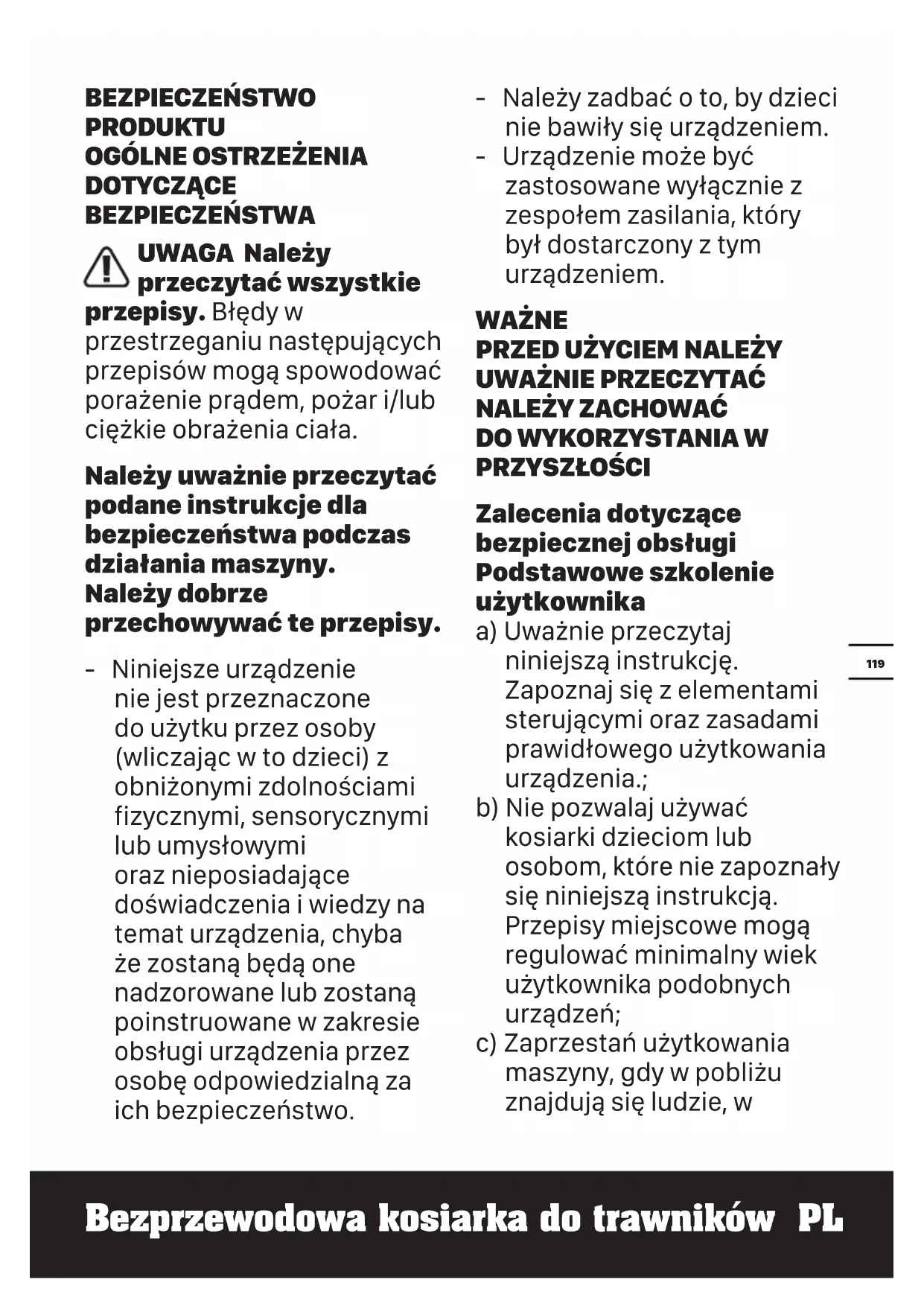 Zalecenia dotyczące bezpiecznej obsługi Podstawowe szkolenie użytkownika a) Uważnie przeczytaj niniejszą instrukcję. Zapoznaj się z elementami sterującymi oraz zasadami prawidłowego użytkowania urządzenia.; b) Nie pozwalaj używać kosiarki dzieciom lub osobom, które nie zapoznały się niniejszą instrukcją. Przepisy miejscowe mogą regulować minimalny wiek użytkownika podobnych urządzeń; c) Zaprzestań użytkowania maszyny, gdy w pobliżu znajdują się ludzie, w120 Bezprzewodowa kosiarka do trawników PL szczególności dzieci, lub zwierzęta domowe; d) Zapamiętaj, że operator lub użytkownik jest odpowiedzialny za wypadki lub zagrożenia dla innych ludzi lub ich mienia. Przygotowanie a) Podczas koszenia należy zawsze nosić odpowiednio zakryte obuwie i spodnie z długimi nogawkami. Nie wolno kosić będąc boso lub w sandałach z odkrytymi palcami; b) Należy dokładnie sprawdzić teren, gdzie używane będzie urządzenie i usunąć wszystkie obiekty, które mogą być wyrzucane przez maszynę; c) Przed uruchomieniem kosiarki należy zawsze sprawdzić, czy ostrza, śruby mocujące ostrza oraz zespół tnący nie uległy zużyciu lub uszkodzeniu. Wszystkie zużyte bądź uszkodzone ostrza i śruby należy wymieniać razem, aby zapewnić równomierną eksploatację tych elementów; Należy wymienić uszkodzone i nieczytelne etykiety. Działanie a) Kosić należy wyłącznie w świetle dziennym lub przy dobrym oświetleniu sztucznym; b) Należy w miarę możliwości unikać koszenia wilgotnej trawy; c) Podczas koszenia na pochyłym terenie należy uważać, aby nie stracić równowagi; d) Należy chodzić, nigdy nie należy biegać; e) Podczas pracy z maszynami poruszającymi się na kołach, koszenie należy prowadzić w poprzek stoków, nigdy w górę i w dół; f) Podczas zmiany kierunku koszenia na terenie pochyłym należy zachować szczególną ostrożność; g) Nie wolno kosić nadmiernie nachylonych stoków; h) Podczas cofania lub przyciągania kosiarki do siebie należy zachować szczególną ostrożność;