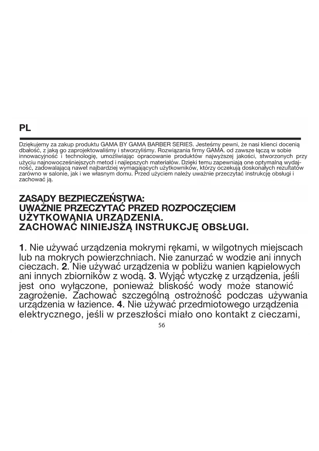 ostrza, w związku z czym należy zachować ostrożność podczas jego użytkowania, aby zapobiec skaleczeniom. 12. W razie potrzeby wymiany akcesoriów urządzenia należy pamiętać, aby wyłączyć urządzenie przed przystąpieniem do wymiany. 13. Zaleca się zainstalowanie dodatkowego zabezpieczenia w obwodzie elektrycznym zasilania łazienki w postaci wyłącznika różnicowo-prądowego (ang. RCD) o prądzie różnicowym nie większym niż 30 mA. Zasięgnąć porady u zaufanego elektryka. Produktu tego nie mogą używać osoby o ograniczonych zdolnościach fizycznych (w tym dzieci), ruchowych i umysłowych, ani osoby niemające odpowiedniej wiedzy o produkcie, chyba że otrzymały one instrukcje dotyczące użytkowania produktu lub użytkują produkt pod nadzorem osoby odpowiedzialnej za ich bezpieczeństwo. Należy zawsze zwracać uwagę, aby dzieci nie bawiły się tym produktem. 58ESP Gracias por haber adquirido un producto GAMA BY GAMA BARBER SERIES. Estamos seguros de que sabrás valorar el cuidado con el que ha sido proyectado y realizado. La investigación GAMA continúa, como siempre, conjugando innovación y tecnología para llegar a productos de altísima calidad, creados con las técnicas más modernas y los mejores materiales. Esto garantiza óptimas performances, estudiadas para los usuarios más exigentes que desean obtener un resultado excepcional. Antes de utilizarlo, lee atentamente estas instrucciones y consérvalas. ADVERTENCIAS: LEER ATENTAMENTE ANTES DE USAR EL PRODUCTO. GUARDAR ESTAS INSTRUCCIONES.