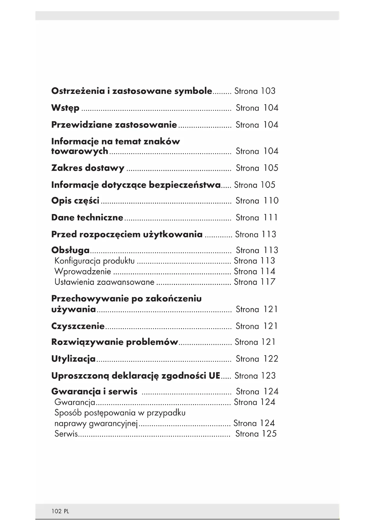P Wstęp Gratulujemy Państwu zakupu nowego produktu. Tym samym zdecydowali się Państwo na zakup produktu wysokiej jakości. Instrukcja obsługi jest częścią tego produktu. Zawiera ona ważne wskazówki dotyczące bezpieczeństwa, użytkowania i utylizacji. Przed pierwszym użyciem produktu należy zapoznać się ze wszystkimi wskazówkami dotyczącymi obsługi i bezpieczeństwa. Używać produktu wyłącznie zgodnie z jego poniżej opisanym przeznaczeniem. W przypadku przekazania produktu innej osobie należy dołączyć do niego całą jego dokumentację. P Przewidziane zastosowanie Ten ZESTAW KRÓTKOFALÓWEK PMR (zwany dalej "produktem"), jest urządzeniem technologii informacyjnej. Ten produkt jest przeznaczony do transmisji bezprzewodowej komunikatów głosowych w niewielkich obszarowo terenach, w tym samym budynku i podczas działań wykonywanych na zewnątrz w zasięgu wzroku. Produkt ten nie jest przeznaczony do użytku w firmach ani do innych celów komercyjnych (np. aplikacje zwiększające wydajność pracy w biurze). Ten produkt można używać wyłącznie do celów prywatnych. Wszelkie inne warunki użytkowania są uznawane za niewłaściwe. Roszczenia wynikające z nieodpowiedniego użytkowania lub nieuprawnionych modyfikacji produktu nie będą podlegać gwarancji. Tego typu działania użytkownik podejmuje na własne ryzyko. P Informacje na temat znaków towarowych USB