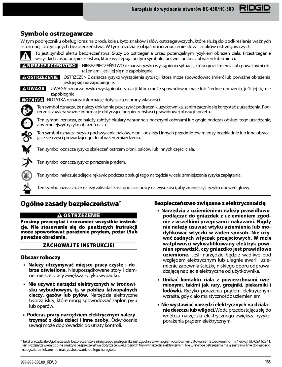 - Tekst w rozdziale Ogólne zasady bezpieczeństwa niniejszego podręcznika jest zgodnie z wymogiem dosłownym cytowaniem stosownej normy 1 edycji UL/CSA 62841. Ten rozdział zawiera ogólne praktyki bezpieczeństwa dotyczące wielu różnych typów narzędzi elektrycznych. Nie wszystkie ostrzeżenia mają zastosowanie do każdego narzędzia, a niektóre nie mają zastosowania do tego narzędzia.156 Narzędzia do wycinania otworów HC-450/HC-300