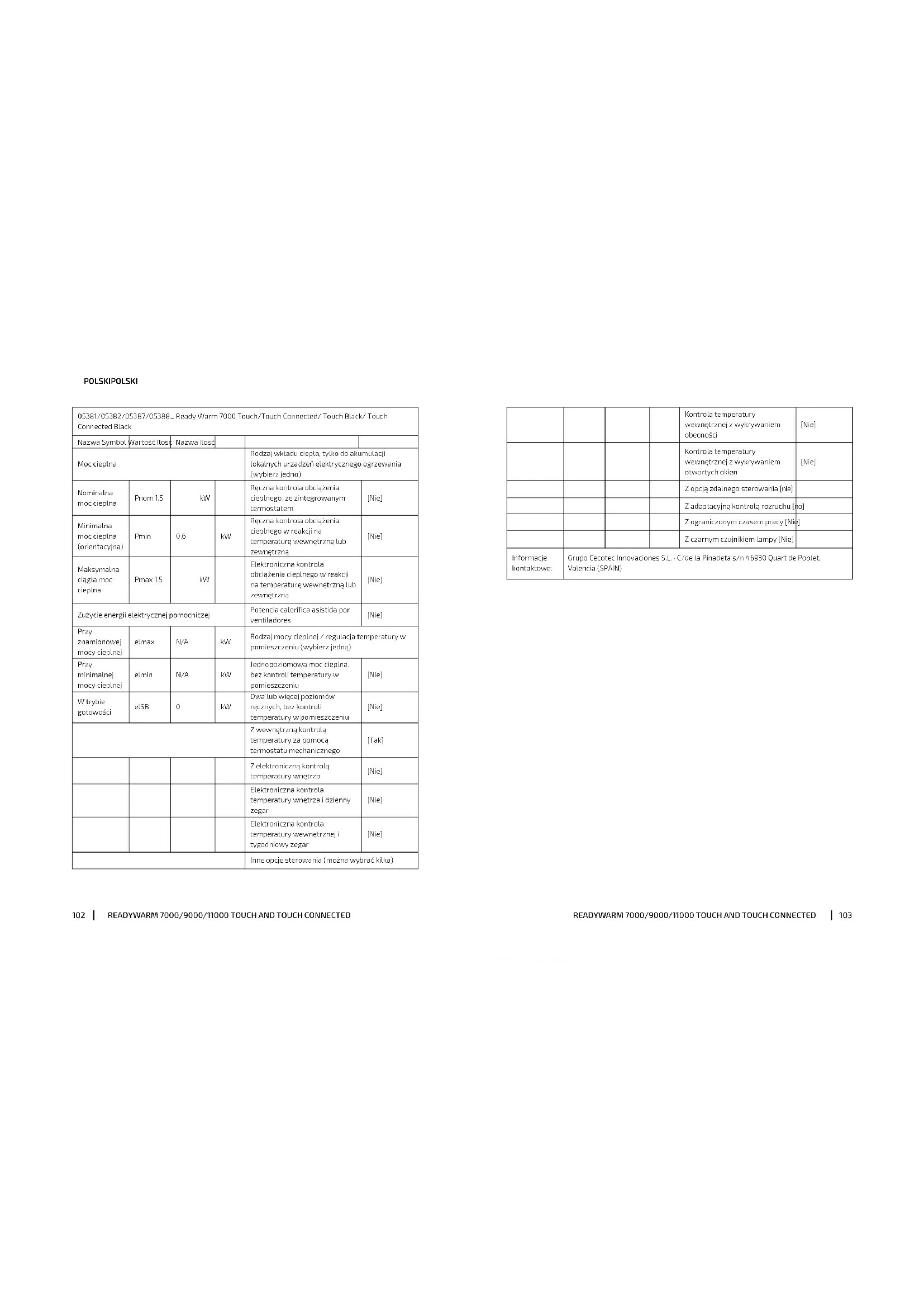 Outras opções de controlo (podem ser selecionadas várias) Controlo de temperatura interior com detetor de presença [não] Controlo de temperatura interior com detetor de janelas abertas [não] Com opção de controlo a distância [não] Com controlo de funcionamento adaptável [não] Com limitação de tempo de funcionamento [não] Com sensor de lâmpada preta [não] Dados de contato: Grupo Cecotec Innovaciones S.L. · C/de la Pinadeta s/n 46930 Quart de Poblet, Valencia (SPAIN) 05385/05386/05391/05392_ Ready Warm 11000 Touch/Touch Connected/ Touch Black/ Touch Connected Black Partida Símbolo Valor Unidade Partida Unidade Potência caloríca Tipo de fornecimento de calor, unicamente para os aparelhos de aquecimento local elétricos de acumulação (selecione um) Potência caloríca nominal Pnom 2,5 kW Controlo manual da carga de calor, com termostato integrado [não] Potência caloríca mínima (indicativa) Pmin 0,8 kW Controlo manual de carga de calor com resposta à temperatura interior ou exterior [não] Potência caloríca máxima contínua Pmax 2,5 kW Controlo eletrónico de carga de calor com resposta à temperatura interior ou exterior [não] Consumo auxiliar de eletricidade Potência caloríca assistida por ventoinhas [não] A potência caloríca nominal elmax N/A kW Tipo de controlo de potência caloríca/de temperatura interior (selecione um) A potência caloríca mínima almin N/A kW Potência caloríca de um só nível, sem controlo de temperatura interior [não] Em modo standby elSB 0 kW Dois ou mais níveis manuais, sem controlo de temperatura interior [não] Com controlo de temperatura interior mediante termostato mecânico [sim] Com controlo eletrónico de temperatura interior [não] Controlo eletrónico de temperatura interior e temporizador diário [não] Controlo eletrónico de temperatura interior e temporizador semanal [não]READYWARM 7000/9000/11000 TOUCH AND TOUCH CONNECTEDREADYWARM 7000/9000/11000 TOUCH AND TOUCH CONNECTED 103102 POLSKI POLSKI Kontrola temperatury wewnętrznej z wykrywaniem obecności [Nie] Kontrola temperatury wewnętrznej z wykrywaniem otwartych okien [Nie] Z opcją zdalnego sterowania [nie] Z adaptacyjną kontrolą rozruchu [no] Z ograniczonym czasem pracy [Nie] Z czarnym czujnikiem lampy [Nie] Informacje kontaktowe: Grupo Cecotec Innovaciones S.L. · C/de la Pinadeta s/n 46930 Quart de Poblet, Valencia (SPAIN) 05381/05382/05387/05388_ Ready Warm 7000 Touch/Touch Connected/ Touch Black/ Touch Connected Black Nazwa Symbol Wartość Ilosc Nazwa Ilosć Moc cieplna Rodzaj wkładu ciepła, tylko do akumulacji lokalnych urządzeń elektrycznego ogrzewania (wybierz jedno) Nominalna moc cieplna Pnom 1,5 kW Ręczna kontrola obciążenia cieplnego, ze zintegrowanym termostatem [Nie] Minimalna moc cieplna (orientacyjna) Pmin 0,6 kW Ręczna kontrola obciążenia cieplnego w reakcji na temperaturę wewnętrzną lub zewnętrzną [Nie] Maksymalna ciągła moc cieplna Pmax 1,5 kW Elektroniczna kontrola obciążenia cieplnego w reakcji na temperaturę wewnętrzną lub zewnętrzną [Nie] Zużycie energii elektrycznej pomocniczej Potencia caloríca asistida por ventiladores [Nie] Przy znamionowej mocy cieplnej elmax N/A kW Rodzaj mocy cieplnej / regulacja temperatury w pomieszczeniu (wybierz jedną) Przy minimalnej mocy cieplnej elmin N/A kW Jednopoziomowa moc cieplna, bez kontroli temperatury w pomieszczeniu [Nie] W trybie gotowości elSB 0 kW Dwa lub więcej poziomów ręcznych, bez kontroli temperatury w pomieszczeniu [Nie] Z wewnętrzną kontrolą temperatury za pomocą termostatu mechanicznego [Tak] Z elektroniczną kontrolą temperatury wnętrza [Nie] Elektroniczna kontrola temperatury wnętrza i dzienny zegar [Nie] Elektroniczna kontrola temperatury wewnętrznej i tygodniowy zegar [Nie] Inne opcje sterowania (można wybrać kilka)READYWARM 7000/9000/11000 TOUCH AND TOUCH CONNECTEDREADYWARM 7000/9000/11000 TOUCH AND TOUCH CONNECTED 105104 POLSKI POLSKI Elektroniczna kontrola temperatury wewnętrznej i tygodniowy zegar [Nie] Inne opcje sterowania (można wybrać kilka) Kontrola temperatury wewnętrznej z wykrywaniem obecności [Nie] Kontrola temperatury wewnętrznej z wykrywaniem otwartych okien [Nie] Z opcją zdalnego sterowania [nie] Z adaptacyjną kontrolą rozruchu [no] Z ograniczonym czasem pracy [Nie] Z czarnym czujnikiem lampy [Nie] Informacje kontaktowe: Grupo Cecotec Innovaciones S.L. · C/de la Pinadeta s/n 46930 Quart de Poblet, Valencia (SPAIN) 05383/05384/05389/05390_ Ready Warm 9000 Touch/Touch Connected/ Touch Black/ Touch Connected Black Nazwa Symbol Wartość Ilosc Nazwa Ilosć Moc cieplna Rodzaj wkładu ciepła, tylko do akumulacji lokalnych urządzeń elektrycznego ogrzewania (wybierz jedno) Nominalna moc cieplna Pnom 2,0 kW Ręczna kontrola obciążenia cieplnego, ze zintegrowanym termostatem [Nie] Minimalna moc cieplna (orientacyjna) Pmin 0,8 kW Ręczna kontrola obciążenia cieplnego w reakcji na temperaturę wewnętrzną lub zewnętrzną [Nie] Maksymalna ciągła moc cieplna Pmax 2,0 kW Elektroniczna kontrola obciążenia cieplnego w reakcji na temperaturę wewnętrzną lub zewnętrzną [Nie] Zużycie energii elektrycznej pomocniczej Potencia caloríca asistida por ventiladores [Nie] Przy znamionowej mocy cieplnej elmax N/A kW Rodzaj mocy cieplnej / regulacja temperatury w pomieszczeniu (wybierz jedną) Przy minimalnej mocy cieplnej elmin N/A kW Jednopoziomowa moc cieplna, bez kontroli temperatury w pomieszczeniu [Nie] W trybie gotowości elSB 0 kW Dwa lub więcej poziomów ręcznych, bez kontroli temperatury w pomieszczeniu [Nie] Z wewnętrzną kontrolą temperatury za pomocą termostatu mechanicznego [Tak] Z elektroniczną kontrolą temperatury wnętrza [Nie] Elektroniczna kontrola temperatury wnętrza i dzienny zegar [Nie]READYWARM 7000/9000/11000 TOUCH AND TOUCH CONNECTEDREADYWARM 7000/9000/11000 TOUCH AND TOUCH CONNECTED 107106 POLSKI POLSKI Elektroniczna kontrola temperatury wnętrza i dzienny zegar [Nie] Elektroniczna kontr