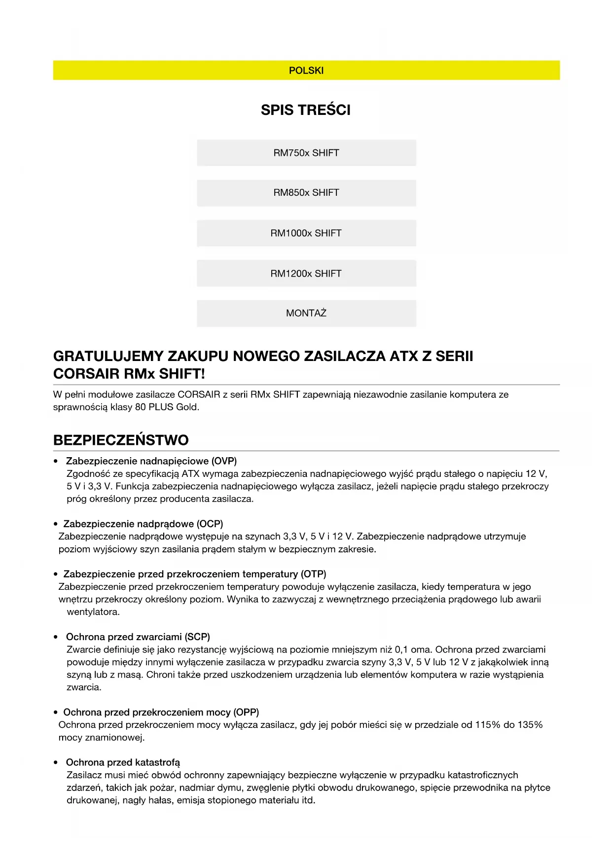 - Ochrona przed katastrofą Zasilacz musi mieć obwód ochronny zapewniający bezpieczne wyłączenie w przypadku katastroficznych zdarzeń, takich jak pożar, nadmiar dymu, zwęglenie płytki obwodu drukowanego, spięcie przewodnika na płytce drukowanej, nagły hałas, emisja stopionego materiału itd. BEZPIECZEŃSTWO W pełni modułowe zasilacze CORSAIR z serii RMx SHIFT zapewniają niezawodnie zasilanie komputera ze sprawnością klasy 80 PLUS Gold. GRATULUJEMY ZAKUPU NOWEGO ZASILACZA ATX Z SERII CORSAIR RMx SHIFT! RM750x SHIFT RM850x SHIFT RM1000x SHIFT RM1200x SHIFT MONTAŻ1 POLSKI POLSKI TABELA ZASILANIA CORSAIR RM750x SHIFT MAKS. OBCIĄŻENIE MAKS. MOC WYJŚCIOWA