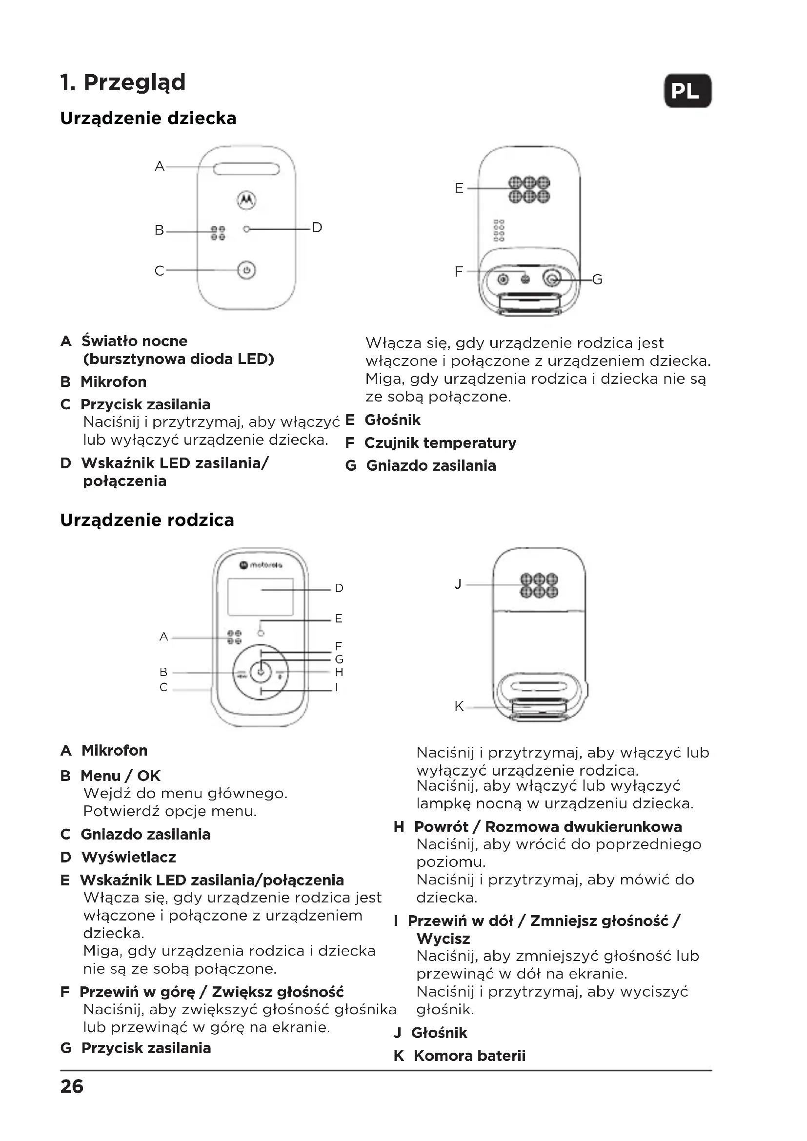 Urządzenie dziecka A Światło nocne (bursztynowa dioda LED) B Mikrofon C Przycisk zasilania Naciśnij i przytrzymaj, aby włączyć lub wyłączyć urządzenie dziecka. D Wskaźnik LED zasilania/ połączenia Włącza się, gdy urządzenie rodzica jest włączone i połączone z urządzeniem dziecka. Miga, gdy urządzenia rodzica i dziecka nie są ze sobą połączone. E Głośnik F Czujnik temperatury G Gniazdo zasilania Urządzenie rodzica A Mikrofon B Menu / OK Wejdź do menu głównego. Potwierdź opcje menu. C Gniazdo zasilania D Wyświetlacz E Wskaźnik LED zasilania/połączenia Włącza się, gdy urządzenie rodzica jest włączone i połączone z urządzeniem dziecka. Miga, gdy urządzenia rodzica i dziecka nie są ze sobą połączone. F Przewiń w górę / Zwiększ głośność Naciśnij, aby zwiększyć głośność głośnika lub przewinąć w górę na ekranie. G Przycisk zasilania