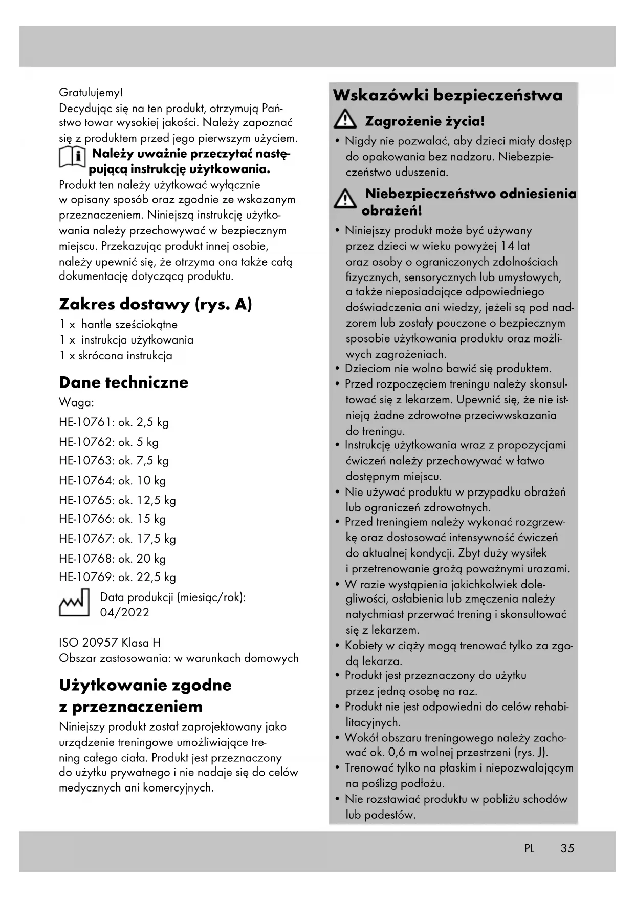 Ważne: zwrócić uwagę, aby uda były ułożone równolegle do siebie. W trak- cie wykonywania ćwiczenia miednica powinna być wysunięta do przodu, a tułów pozostać wyprostowany.40 Przechowywanie, czyszczenie Podczas nieużywania należy zawsze przecho- wywać produkt w suchym i czystym miejscu, w temperaturze pokojowej. Czyścić wyłącznie przy użyciu wilgotnej ście- reczki, następnie wytrzeć do sucha. WAŻNE! Nie czyścić przy użyciu ostrych środ- ków czyszczących. Uwagi odnośnie recyklingu Artykuł oraz materiały opakowaniowe nale- ży usunąć zgodnie z aktualnymi przepisami obowiązującymi w danym miejscu. Materiały opakowaniowe, jak np. worki foliowe nie powinny znaleźć się w rękach dzieci. Materiał opakowaniowy należy przechowywać w miej- scu niedostępnym dla dzieci. Zutylizować produkt i opakowanie w sposób przyjazny dla środowiska. Kod materiału do recyklingu służy do oznaczenia różnych materiałów przeznaczonych do zwrotu do przetwór- stwa wtórnego (recyklingu). Kod składa się z symbolu, który powinien odzwierciedlać cykl odzysku, oraz numeru oznaczającego materiał. Wskazówki dotyczące gwa- rancji i obsługi serwisowej Artykuł został wyprodukowany z najwyższą starannością i pod stałą kontrolą. DELTA-SPORT HANDELSKONTOR GmbH przyznaje klien- towi końcowemu na niniejszy artykuł trzy lata gwarancji od daty zakupu (okres gwarancyjny) z zastrzeżeniem poniższych postanowień. Gwa- rancja dotyczy wyłącznie wad materiałowych i wad wykonania. Gwarancja nie obejmuje części, które podlegają normalnemu zużyciu i z tego względu należy je traktować jako części zużywalne (np. baterie) i nie obejmuje części kruchych, np. przełączników, akumulatorów ani części wykonanych ze szkła. Wyklucza się roszczenia z tytułu niniejszej gwa- rancji w przypadku użycia artykułu w sposób niewłaściwy lub sprzeczny z jego przeznacze- niem lub w sposób wykraczający poza przewi- dziane przeznaczenie lub poza przewidziany zakres użytkowania lub jeśli wytyczne zawarte w instrukcji obsługi nie były przestrzegane, chyba że klient końcowy udowodni istnienie wady materiałowej lub wady wykonania, która nie wynika z podanych wyżej przyczyn. Roszczenia z tytułu gwarancji można zgłaszać wyłącznie w okresie gwarancyjnym za okaza- niem oryginalnego dowodu zakupu. Prosimy zatem zachować oryginalny dowód zakupu! W przypadku jakichkolwiek reklamacji prosimy skontaktować się z nami najpierw za pośred- nictwem podanej poniżej infolinii serwisowej lub drogą e-mailową. W przypadku objętym gwarancją artykuł zostanie – według naszego uznania – bezpłatnie naprawiony, wymieniony lub nastąpi zwrot ceny zakupu. Z gwarancji nie wynikają żadne inne prawa. Niniejsza gwarancja nie ogranicza Państwa ustawowych praw, w szczególności roszczeń gwarancyjnych wobec danego sprzedawcy. W przypadku wymiany części lub całego arty- kułu okres gwarancji przedłuża się o trzy lata zgodnie z art. 581 § 1 kodeksu cywilnego. Po upłynięciu czasu gwarancji powstałe naprawy są płatne. IAN: 404074_2110 (22,5 kg) IAN: 404075_2110 (20 kg) IAN: 404076_2110 (17,5 kg) IAN: 404077_2110 (15 kg) IAN: 404078_2110 (12,5 kg) IAN: 404080_2110 (10 kg) IAN: 404081_2110 (7,5 kg) IAN: 404083_2110 (5 kg) IAN: 404084_2110 (2,5 kg) Serwis Polska Tel.: 22 397 4996 E-Mail: deltasport@lidl.pl PL41CZ Srdečně blahopřejeme! Svým nákupem jste se rozhodli pro kvalitní výro- bek. Před prvním použitím se prosím seznamte s tímto výrobkem. Pozorně si přečtete následující návod k použití. Používejte tento výrobek pouze tak, jak je popsáno, a pro uvedené účely. Uschovejte si tento návod k použití pro budoucí použití. Pokud výrobek předáte třetí osobě, předejte jí i veške- rou dokumentaci. Obsah balení (obr. A) 1 x šestihranná činka 1 x návod k použití 1 x skrócona instrukcja Technické údaje Hmotnost: HE-10761: cca 2,5 kg HE-10762: cca 5 kg HE-10763: cca 7,5 kg HE-10764: cca 10 kg HE-10765: cca 12,5 kg HE-10766: cca 15 kg HE-10767: cca 17,5 kg HE-10768: cca 20 kg HE-10769: cca 22,5 kg Datum výroby (měsíc/rok): 04/2022 ISO 20957 Třída H Oblast použití: domácí použití Použití dle určení Tento výrobek byl vyvinut jako cvičební nářadí pro trénování celého těla. Výrobek je určen pro soukromé použití a není vhodný pro lékařské a komerční účely. Bezpečnostní pokyny Nebezpečí ohrožení života!