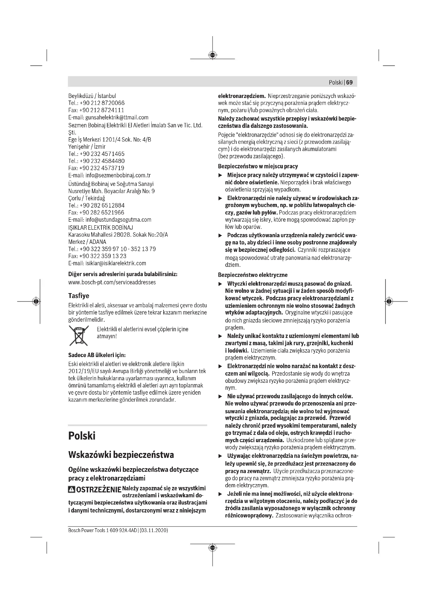 Karasoku Mahallesi 28028. Sokak No:20/A Merkez / ADANA Tel.: +903223599710 -3521379 Fax: +903223591323 E-mail: isiklar@isiklarelektrik.com Diğer servis adreslerini şurada bulabilirsiniz: www.bosch-pt.com/serviceaddresses Tasfiye Elektrikli el aleti, aksesuar ve ambalaj malzemesi çevre dostu bir yöntemle tasfiye edilmek üzere tekrar kazanım merkezine gönderilmelidir. Elektrikli el aletlerini evsel çöplerin içine atmayın! Sadece AB ülkeleri için: Eski elektrikli el aletleri ve elektronik aletlere ilişkin 2012/19/EU sayılı Avrupa Birliği yönetmeliği ve bunların tek tek ülkelerin hukuklarına uyarlanması uyarınca, kullanım ömrünü tamamlamış elektrikli el aletleri ayrı ayrı toplanmak ve çevre dostu bir yöntemle tasfiye edilmek üzere yeniden kazanım merkezlerine gönderilmek zorundadır. Polski Wskazówki bezpieczeństwa Ogólne wskazówki bezpieczeństwa dotyczące pracy z elektronarzędziami OSTRZEŻENIE Należy zapoznać się ze wszystkimi ostrzeżeniami i wskazówkami do- tyczącymi bezpieczeństwa użytkowania oraz ilustracjami i danymi technicznymi, dostarczonymi wraz z niniejszym elektronarzędziem. Nieprzestrzeganie poniższych wskazó- wek może stać się przyczyną porażenia prądem elektrycz- nym, pożaru i/lub poważnych obrażeń ciała. Należy zachować wszystkie przepisy i wskazówki bezpie- czeństwa dla dalszego zastosowania. Pojęcie "elektronarzędzie" odnosi się do elektronarzędzi za- silanych energią elektryczną z sieci (z przewodem zasilają- cym) i do elektronarzędzi zasilanych akumulatorami (bezprzewodu zasilającego). Bezpieczeństwo w miejscu pracy u Miejsce pracy należy utrzymywać w czystości i zapew- nić dobre oświetlenie. Nieporządek i brak właściwego oświetlenia sprzyjają wypadkom. u Elektronarzędzi nie należy używać w środowiskach za- grożonym wybuchem, np. w pobliżu łatwopalnych cie- czy, gazów lub pyłów. Podczas pracy elektronarzędziem wytwarzają się iskry, które mogą spowodować zapłon py- łów lub oparów. u Podczas użytkowania urządzenia należy zwrócić uwa- gę na to, aby dzieci i inne osoby postronne znajdowały się w bezpiecznej odległości. Czynniki rozpraszające mogą spowodować utratę panowania nad elektronarzę- dziem. Bezpieczeństwo elektryczne u Wtyczki elektronarzędzi muszą pasować do gniazd. Nie wolno w żadnej sytuacji i w żaden sposób modyfi- kować wtyczek. Podczas pracy elektronarzędziami z uziemieniem ochronnym nie wolno stosować żadnych wtyków adaptacyjnych. Oryginalne wtyczki i pasujące do nich gniazda sieciowe zmniejszają ryzyko porażenia prądem. u Należy unikać kontaktu z uziemionymi elementami lub zwartymi z masą, takimi jak rury, grzejniki, kuchenki ilodówki. Uziemienie ciała zwiększa ryzyko porażenia prądem elektrycznym. u Elektronarzędzi nie wolno narażać na kontakt z desz- czem ani wilgocią. Przedostanie się wody do wnętrza obudowy zwiększa ryzyko porażenia prądem elektrycz- nym. u Nie używać przewodu zasilającego do innych celów. Nie wolno używać przewodu do przenoszenia ani prze- suwania elektronarzędzia; nie wolno też wyjmować wtyczki z gniazda, pociągając za przewód. Przewód należy chronić przed wysokimi temperaturami, należy go trzymać zdala od oleju, ostrych krawędzi i rucho- mych części urządzenia. Uszkodzone lub splątane prze- wody zwiększają ryzyko porażenia prądem elektrycznym. u Używając elektronarzędzia na świeżym powietrzu, na- leży upewnić się, że przedłużacz jest przeznaczony do pracy na zewnątrz. Użycie przedłużacza przeznaczone- go do pracy na zewnątrz zmniejsza ryzyko porażenia prą- dem elektrycznym. u Jeżeli nie ma innej możliwości, niż użycie elektrona- rzędzia w wilgotnym otoczeniu, należy podłączyć je do źródła zasilania wyposażonego w wyłącznik ochronny różnicowoprądowy. Zastosowanie wyłącznika ochron- Bosch Power Tools 1 609 92A 4AD | (03.11.2020)70 | Polski nego różnicowoprądowego zmniejsza ryzyko porażenia prądem elektrycznym. Bezpieczeństwo osób u Podczas pracy z elektronarzędziem należy zachować czujność, każdą czynność wykonywać ostrożnie i z rozwagą. Nie przystępować do pracy elektronarzę- dziem w stanie zmęczenia lub będąc pod wpływem narkotyków, alkoholu lub leków. Chwila nieuwagi pod- czas pracy może grozić bardzo poważnymi obrażeniami ciała. u Stosować środki ochrony osobistej. Należy zawsze nosić okulary ochronne. Środki ochrony osobistej, np. maska przeciwpyłowa, antypoślizgowe obuwie, kask ochronny czy ochraniacze na uszy, w określonych warun- kach pracy obniżają ryzyko obrażeń ciała. u Należy unikać niezamierzonego uruchomienia narzę- dzia. Przed podłączeniem elektronarzędzia do źródła zasilania i/lub podłączeniem akumulatora, podniesie- niem albo transportem urządzenia, należy upewnić się, że włącznik elektronarzędzia znajduje się w pozy- cji wyłączonej. Przenoszenie elektronarzędzia z palcem opartym na włączniku/wyłączniku lub włożenie do gniaz- da sieciowego wtyczki włączonego narzędzia, może stać się przyczyną wypadków. u Przed włączeniem elektronarzędzia należy usunąć wszystkie narzędzia nastawcze i klucze maszynowe. Narzędzia lub klucze, pozostawione wruchomych czę- ściach urządzenia, mogą spowodować obrażenia ciała. u Należy unikać nienaturalnych pozycji przy pracy. Na- leży dbać o stabilną pozycję przy pracy i zachowanie równowagi. Dzięki temu można będzie łatwiej zapano- wać nad elektronarzędziem w nieprzewidzianych sytu- acjach. u Należy nosić odpowiednią odzież. Nie należy nosić luźnej odzieży ani biżuterii. Włosy i odzież należy trzy- mać z dala od ruchomych części. Luźna odzież, biżuteria lub długie włosy mogą zostać pochwycone przez ruchome części. u Jeżeli producent przewidział możliwość podłączenia odkurzacza lub systemu odsysania pyłu, należy upew- nić się, że s