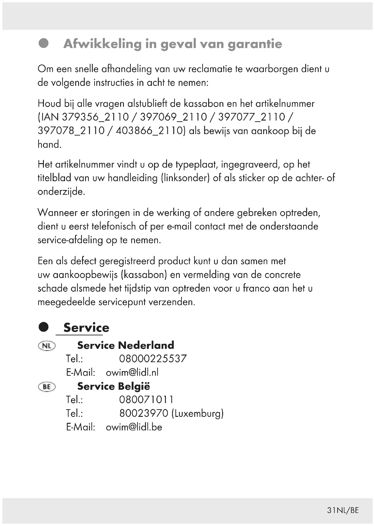 PRZESTROGA! Należy pamiętać, że emalia może zostać uszkodzona, jeśli produkt upadnie lub zostanie uderzony. Utylizacja Opakowanie wykonane jest z materiałów przyjaznych dla środowiska, które można przekazać do utylizacji w lokalnym punkcie przetwarzania surowców wtórnych. Informacji na temat możliwości utylizacji wyeksploatowanego produktu udziela urząd gminy lub miasta.37PL Gwarancja Produkt wyprodukowano według wysokich standardów jakości i poddano skrupulatnej kontroli przed wysyłką. W przypadku wad produktu nabywcy przysługują ustawowe prawa. Gwarancja nie ogranicza ustawowych praw nabywcy produktu. Produkt objęte jest 3 gwarancją, licząc od daty zakupu. Gwarancja wygasa w razie zawinionego przez użytkownika uszkodzenia produktu, niewłaściwego użycia lub konserwacji. W przypadku wystąpienia w ciągu 3 lat od daty zakupu wad materiałowych lub fabrycznych, dokonujemy – według własnej oceny – bezpłatnej naprawy lub wymiany produktu. Świadczenie gwarancyjne obejmuje wady materiałowe i fabryczne. Gwarancja nie obejmuje części produktu ulegających normalnemu zużyciu, uznawanych za części zużywalne (np. baterie) oraz uszkodzeń części łamliwych, np. przełączników, akumulatorów lub wykonanych ze szkła. Zgodnie z Kodeksem Cywilnym art. 581 §1 wraz z wymianą urządzenia lub ważnej części czas gwarancji rozpoczyna się na nowo.38 PL Sposób postępowania w przypadku naprawy gwarancyjnej Aby zapewnić szybkie rozpatrzenie Państwa wniosku, prosimy stosować się do następujących wskazówek: Przed skontaktowaniem się z działem serwisowym należy przygotować paragon i numer artykułu (IAN 379356_2110 / 397069_2110 / 397077_2110 / 397078_2110 / 403866_2110) jako dowód zakupu. Numery artykułów można znaleźć na tabliczce znamionowe, na grawerunku, na stronie tytułowej jego instrukcji (na dole po lewej stronie) lub jako naklejkę na stronie odwrotnej lub spodniej. W razie wystąpienia błędów w działaniu lub innych wad, należy skontaktować się najpierw z wymienionym poniżej działem serwisowym telefonicznie lub pocztą elektroniczną. Produkt uznany za uszkodzony można następnie z dołączeniem dowodu zakupu (paragonu) i podaniem, na czym polega wada i kiedy wystąpiła, przesłać bezpłatnie na podany Państwu adres serwisu. Serwis Serwis Polska Tel.: 008004911946 E-Mail: owim@lidl.pl39CZ