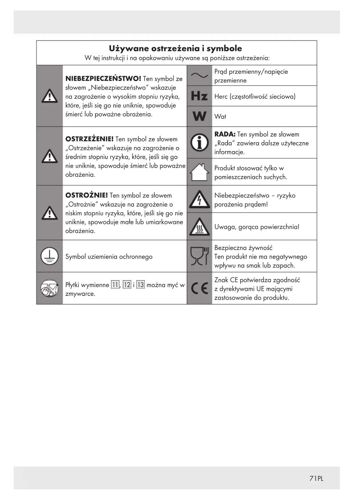 Zastosować inny przepis. Przechowywanie NIEBEZPIECZEŃSTWO! Ryzyko poparzenia! Nie chować produktu bezpośrednio po użyciu. Najpierw należy odczekać, aż produkt całkowicie ostygnie. Wyczyścić produkt przed schowaniem. Kabel zasilania[4] owinąć wokół uchwytu na kabel zasilania [5] na spodzie produktu. Produkt przechowywać w oryginalnym opakowaniu, gdy nie jest używany. Produkt przechowywać w suchym, niedostępnym dla dzieci miejscu.84 PL Utylizacja Opakowanie wykonane jest z materiałów przyjaznych dla środowiska, które można przekazać do utylizacji w lokalnym punkcie przetwarzania surowców wtórnych. Przy segregowaniu odpadów prosimy zwrócić uwagę na oznakowanie materiałów opakowaniowych, oznaczone są one skrótami (a) i numerami (b) o następującym znaczeniu: 1–7: Tworzywa sztuczne / 20–22: Papier i tektura / 80–98: Materiały kompozytowe. Produkt i materiał opakowania nadają się do ponownego przetworzenia, należy je zutylizować osobno w celu lepszego przetworzenia odpadów. Logo Triman jest ważne tylko dla Francji. Informacji na temat możliwości utylizacji wyeksploatowanego produktu udziela urząd gminy lub miasta. Z uwagi na ochronę środowiska nie wyrzucać urządzenia po zakończeniu eksploatacji do odpadów domowych, lecz prawidłowo zutylizować. Informacji o punktach zbiorczych i ich godzinach otwarcia udziela odpowiedni urząd.85PL Gwarancja Produkt wyprodukowano według wysokich standardów jakości i poddano skrupulatnej kontroli przed wysyłką. W przypadku wad produktu nabywcy przysługują ustawowe prawa. Gwarancja nie ogranicza ustawowych praw nabywcy produktu. Produkt objęte jest 3 gwarancją, licząc od daty zakupu. Gwarancja wygasa w razie zawinionego przez użytkownika uszkodzenia produktu, niewłaściwego użycia lub konserwacji. W przypadku wystąpienia w ciągu 3 lat od daty zakupu wad materiałowych lub fabrycznych, dokonujemy – według własnej oceny – bezpłatnej naprawy lub wymiany produktu. Świadczenie gwarancyjne obejmuje wady materiałowe i fabryczne. Gwarancja nie obejmuje części produktu ulegających normalnemu zużyciu, uznawanych za części zużywalne (np. baterie) oraz uszkodzeń części łamliwych, np. przełączników, akumulatorów lub wykonanych ze szkła. Zgodnie z Kodeksem Cywilnym art. 581 §1 wraz z wymianą urządzenia lub ważnej części czas gwarancji rozpoczyna się na nowo. Sposób postępowania w przypadku naprawy gwarancyjnej Aby zapewnić szybkie rozpatrzenie Państwa wniosku, prosimy stosować się do następujących wskazówek: Przed skontaktowaniem się z działem serwisowym należy przygotować paragon i numer artykułu ( IAN 389130_2107) jako dowód zakupu. Numery artykułów można znaleźć na tabliczce znamionowe, na grawerunku, na stronie tytułowej jego instrukcji (na dole po lewej stronie) lub jako naklejkę na stronie odwrotnej lub spodniej. W razie wystąpienia błędów w działaniu lub innych wad, należy skontaktować się najpierw z wymienionym poniżej działem serwisowym telefonicznie lub pocztą elektroniczną. Produkt uznany za uszkodzony można następnie z dołączeniem dowodu zakupu (paragonu) i podaniem, na czym polega wada i kiedy wystąpiła, przesłać bezpłatnie na podany Państwu adres serwisu. Serwis Serwis Polska Tel.: 008004911946 E-Mail: owim@lidl.pl86 CZ Použitá výstražná upozornění a symboly .................... Strana 87 Úvod................................................................ Strana 88 Použití v souladu s určením ............................................. Strana 88 Rozsah dodávky...................................................... Strana 88 Popis dílů ........................................................... Strana 88 Technické údaje . . . . . . . . . . . . . . . . . . . . . . . . . . . . . . . . . . . . . . . . . . . . . . . . . . . . . . Strana 88 Bezpečnostní pokyny ............................................ Strana 89 Před prvním použitím ............................................ Strana 93 Montáž............................................................. Strana 93 Obsluha ............................................................ Strana 93 Pečení sendvičů ...................................................... Strana 94 Grilování ........................................................... Strana 94 Pečení vaflí .......................................................... Strana 95 Recepty ............................................................ Strana 95 Tuňákový sendvič ..................................................... Strana 95 Krůtí sendvič......................................................... Strana 96 Belgické vafle........................................................ Strana 96 Borůvkové vafle ...................................................... Strana 96 Šunkové/sýrové vafle.................................................. Strana 97 Belgické hnědé vafle .................................................. Strana 97 Krevetové špízy se švestkami ............................................ Strana 98 Čištění a péče...................................................... Strana 98 Odstraňování poruch ............................................ Strana 99 Skladování ........................................................ Strana 99 Zlikvidování....................................................... Strana 100 Záruka ............................................................. Strana 101 Postup v případě uplatňování záruky...................................... Strana 101 Servis............................................................... Strana 10187CZ Použitá výstražná upozornění a symboly V tomto návodu k obsluze a na obalu jsou používána následující upozornění: NEBEZPEČÍ! Tento symbol se signální slovem „Nebezpečí“ označuje ohrožení s vysokým stupněm rizika, které má, pokud se mu nezabrání,