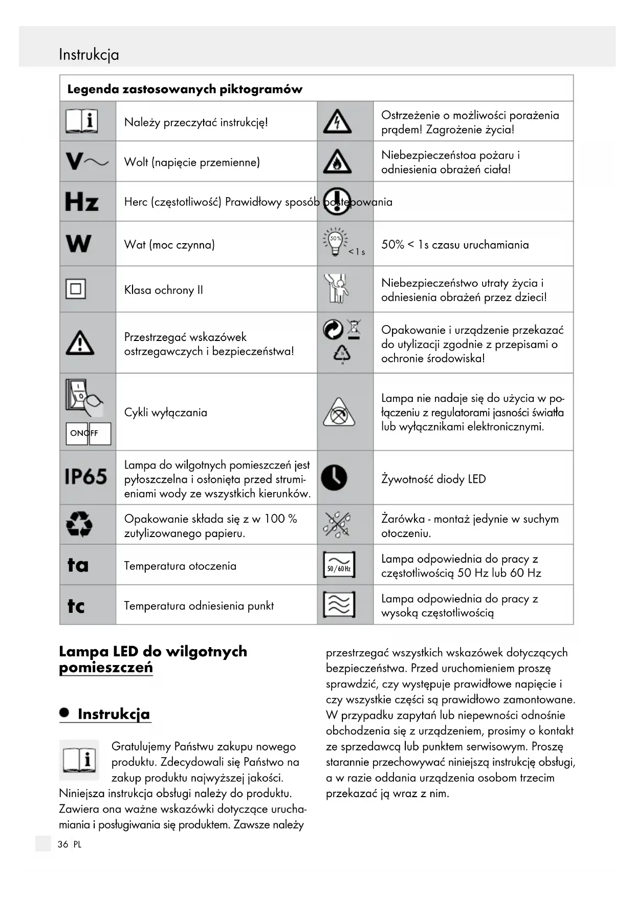 Opakowanie i urządzenie przekazać do utylizacji zgodnie z przepisami o ochronie środowiska! ON OFF Cykli wyłączania Lampa nie nadaje się do użycia w po- łączeniu z regulatorami jasności światła lub wyłącznikami elektronicznymi. Lampa do wilgotnych pomieszczeń jest pyłoszczelna i osłonięta przed strumi- eniami wody ze wszystkich kierunków. Żywotność diody LED Opakowanie składa się z w 100 % zutylizowanego papieru. Żarówka - montaż jedynie w suchym otoczeniu.