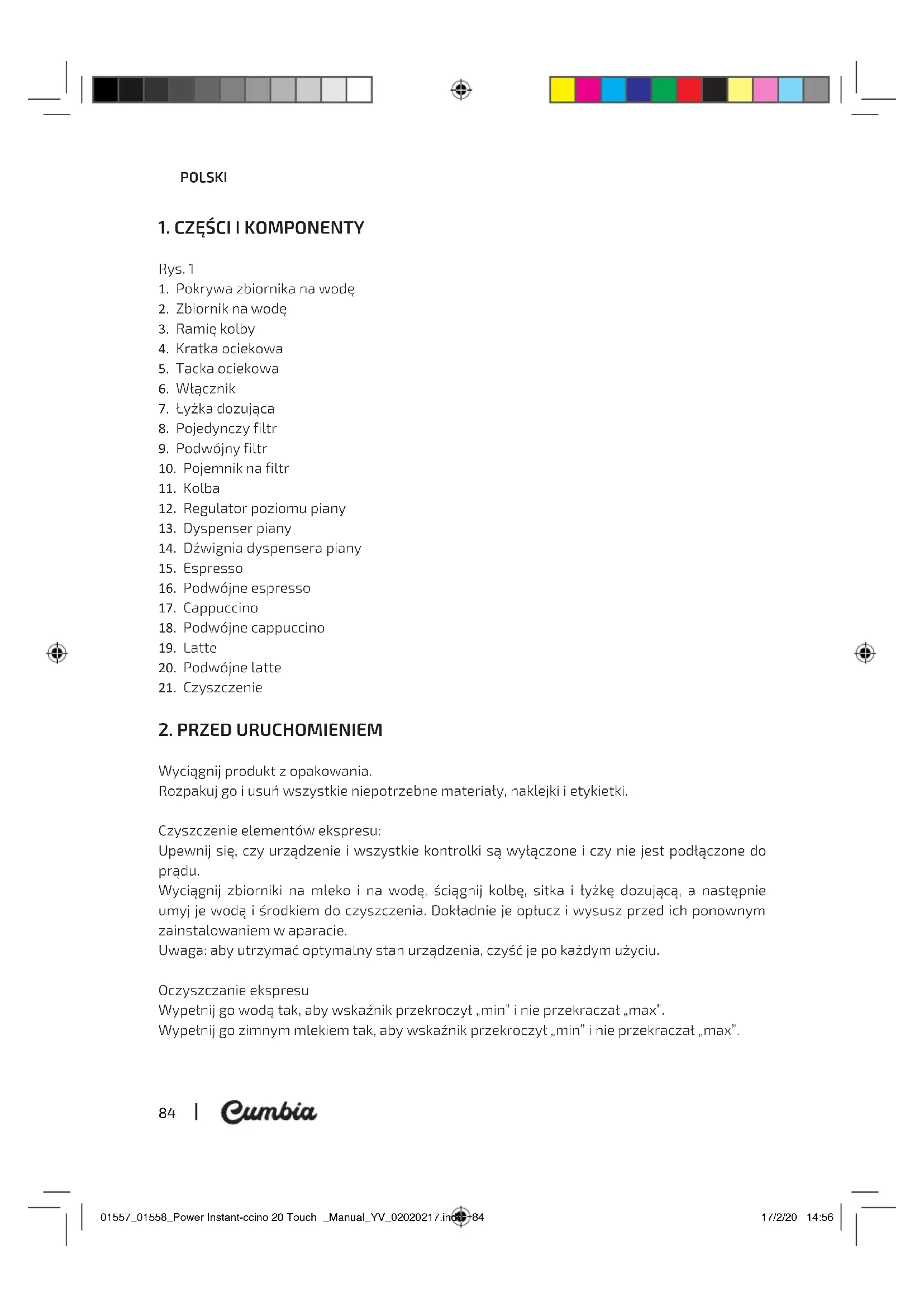Wyciągnij produkt z opakowania. Rozpakuj go i usuń wszystkie niepotrzebne materiały, naklejki i etykietki. Czyszczenie elementów ekspresu: Upewnij się, czy urządzenie i wszystkie kontrolki są wyłączone i czy nie jest podłączone do prądu. Wyciągnij zbiorniki na mleko i na wodę, ściągnij kolbę, sitka i łyżkę dozującą, a następnie umyj je wodą i środkiem do czyszczenia. Dokładnie je opłucz i wysusz przed ich ponownym zainstalowaniem w aparacie. Uwaga: aby utrzymać optymalny stan urządzenia, czyść je po każdym użyciu. Oczyszczanie ekspresu Wypełnij go wodą tak, aby wskaźnik przekroczył „min” i nie przekraczał „max”. Wypełnij go zimnym mlekiem tak, aby wskaźnik przekroczył „min” i nie przekraczał „max”. 01557_01558_Power Instant-ccino 20 Touch _Manual_YV_02020217.indd 8401557_01558_Power Instant-ccino 20 Touch _Manual_YV_02020217.indd 84 17/2/20 14:5617/2/20 14:56POWER INSTANT-CCINO 20 TOUCH WHITE / BLACK