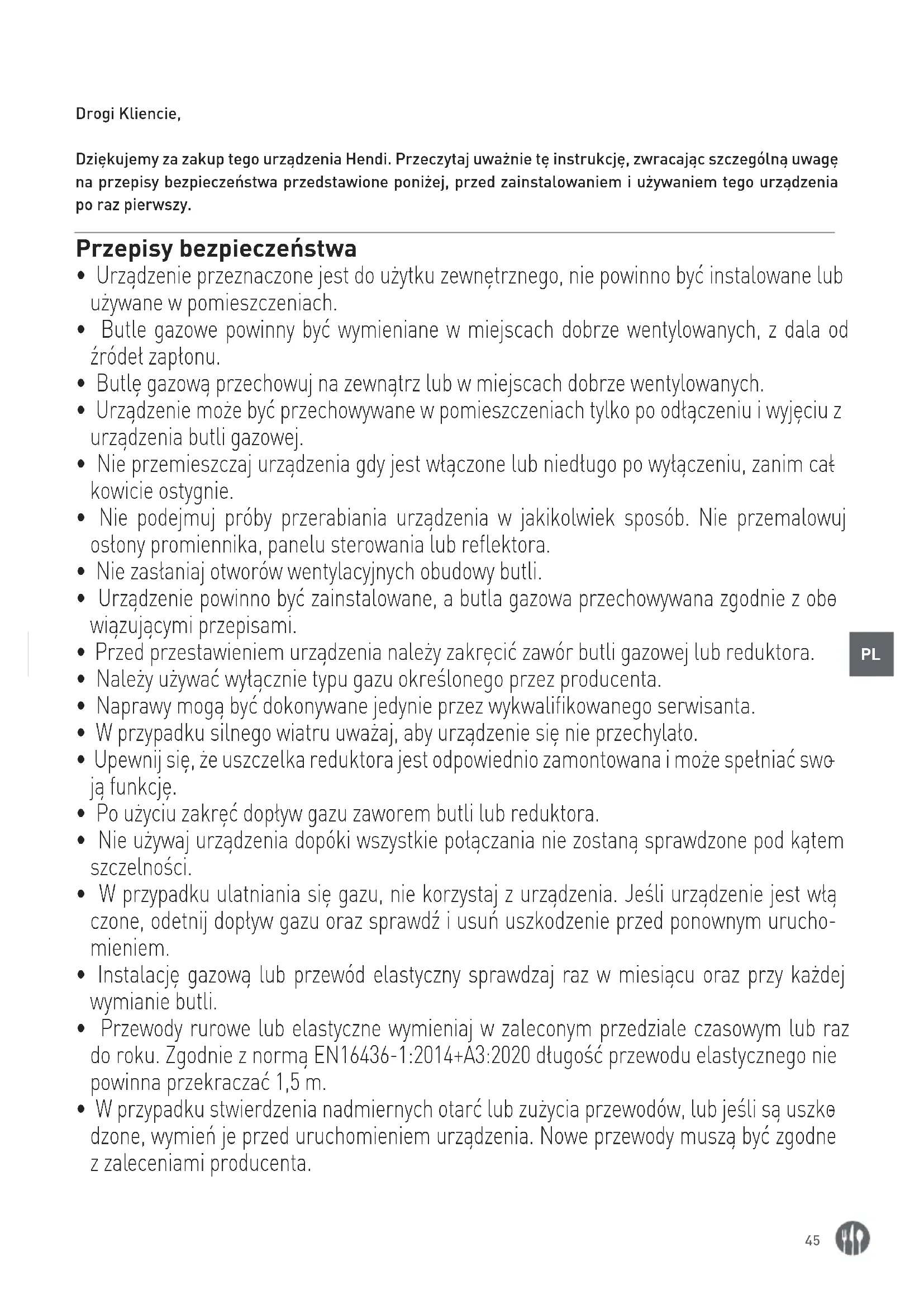 Drogi Kliencie, Dziękujemy za zakup tego urządzenia Hendi. Przeczytaj uważnie tę instrukcję, zwracając szczególną uwagę na przepisy bezpieczeństwa przedstawione poniżej, przed zainstalowaniem i używaniem tego urządzenia po raz pierwszy. Przepisy bezpieczeństwa