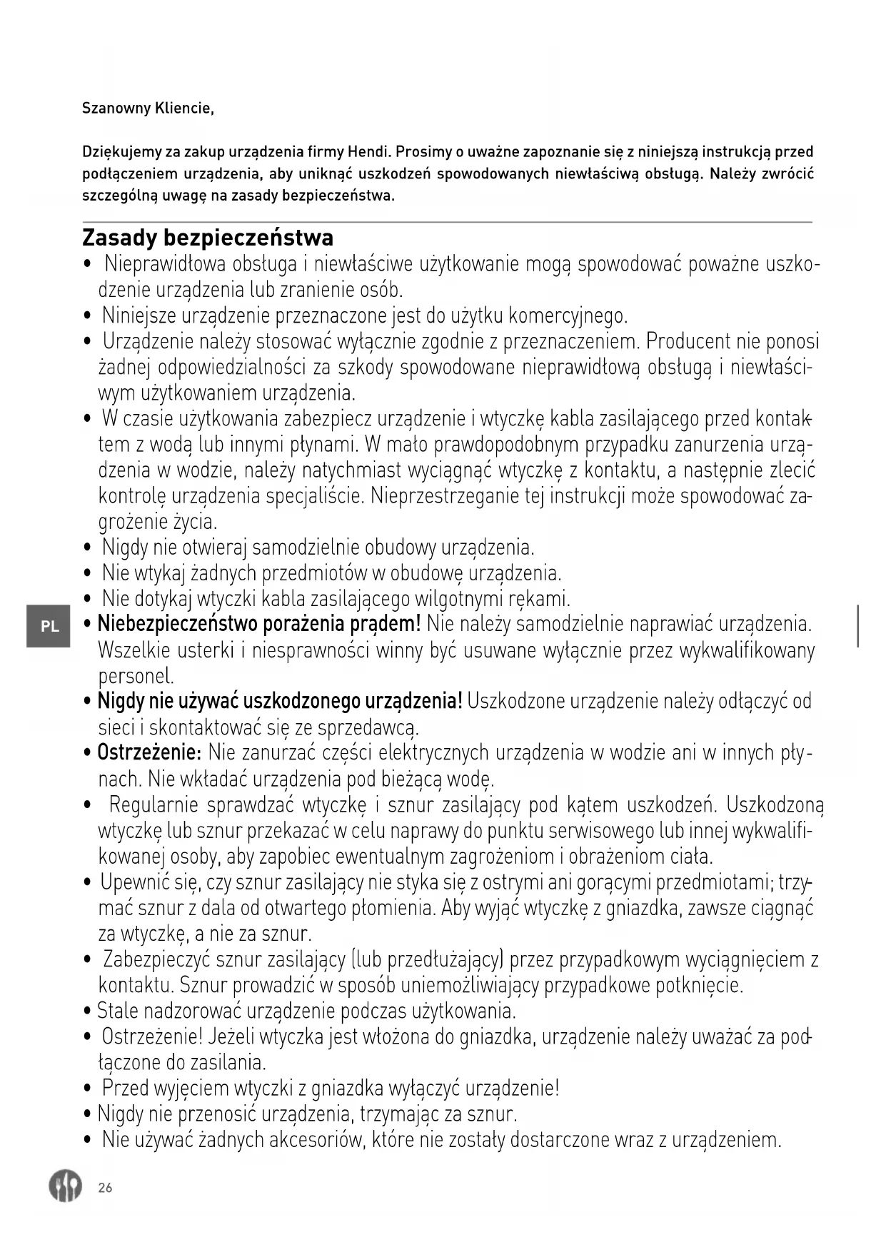 Szanowny Kliencie, Dziękujemy za zakup urządzenia firmy Hendi. Prosimy o uważne zapoznanie się z niniejszą instrukcją przed podłączeniem urządzenia, aby uniknąć uszkodzeń spowodowanych niewłaściwą obsługą. Należy zwrócić szczególną uwagę na zasady bezpieczeństwa. Zasady bezpieczeństwa