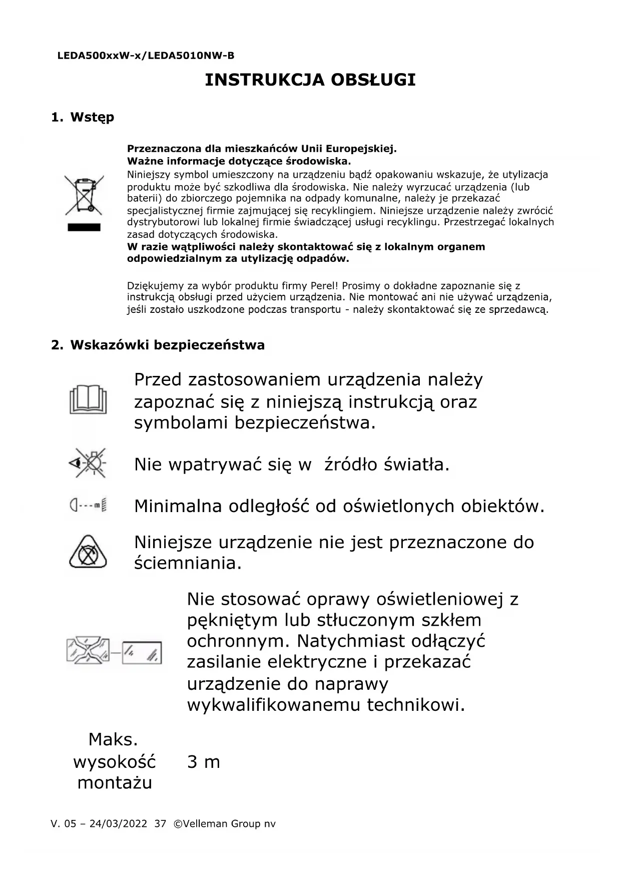 Właścicielem praw autorskich do niniejszej instrukcji jest firma Velleman Group nv. Wszelkie prawa są zastrzeżone na całym świecie. Żadna część niniejszej instrukcji nie może być kopiowana, powielana, tłumaczona ani przenoszona na jakikolwiek nośnik elektroniczny (lub w inny sposób) bez wcześniejszej pisemnej zgody właściciela praw autorskich.LEDA500xxW-x/LEDA5010NW-B