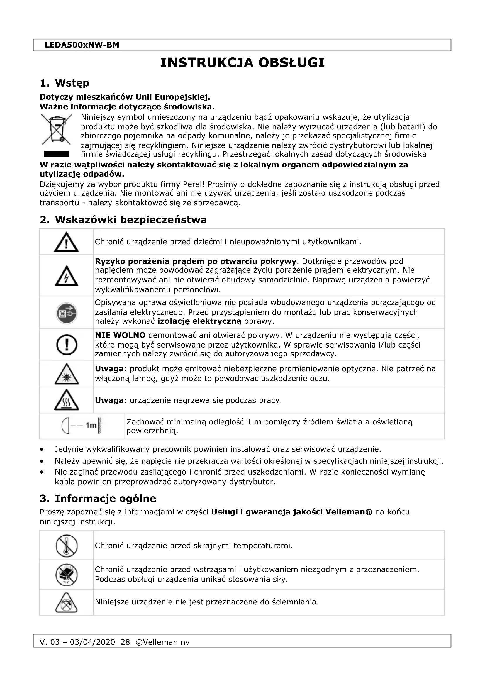 Właścicielem praw autorskich do niniejszej instrukcji jest firma Velleman nv. Wszelkie prawa są zastrzeżone na całym świecie. Żadna część niniejszej instrukcji nie może być kopiowana, powielana, tłumaczona ani przenoszona na jakikolwiek nośnik elektroniczny (lub w inny sposób) bez wcześniejszej pisemnej zgody właściciela praw autorskich.LEDA500xNW-BM