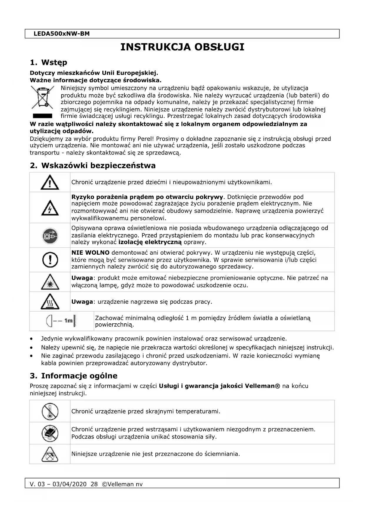 Właścicielem praw autorskich do niniejszej instrukcji jest firma Velleman nv. Wszelkie prawa są zastrzeżone na całym świecie. Żadna część niniejszej instrukcji nie może być kopiowana, powielana, tłumaczona ani przenoszona na jakikolwiek nośnik elektroniczny (lub w inny sposób) bez wcześniejszej pisemnej zgody właściciela praw autorskich.LEDA500xNW-BM