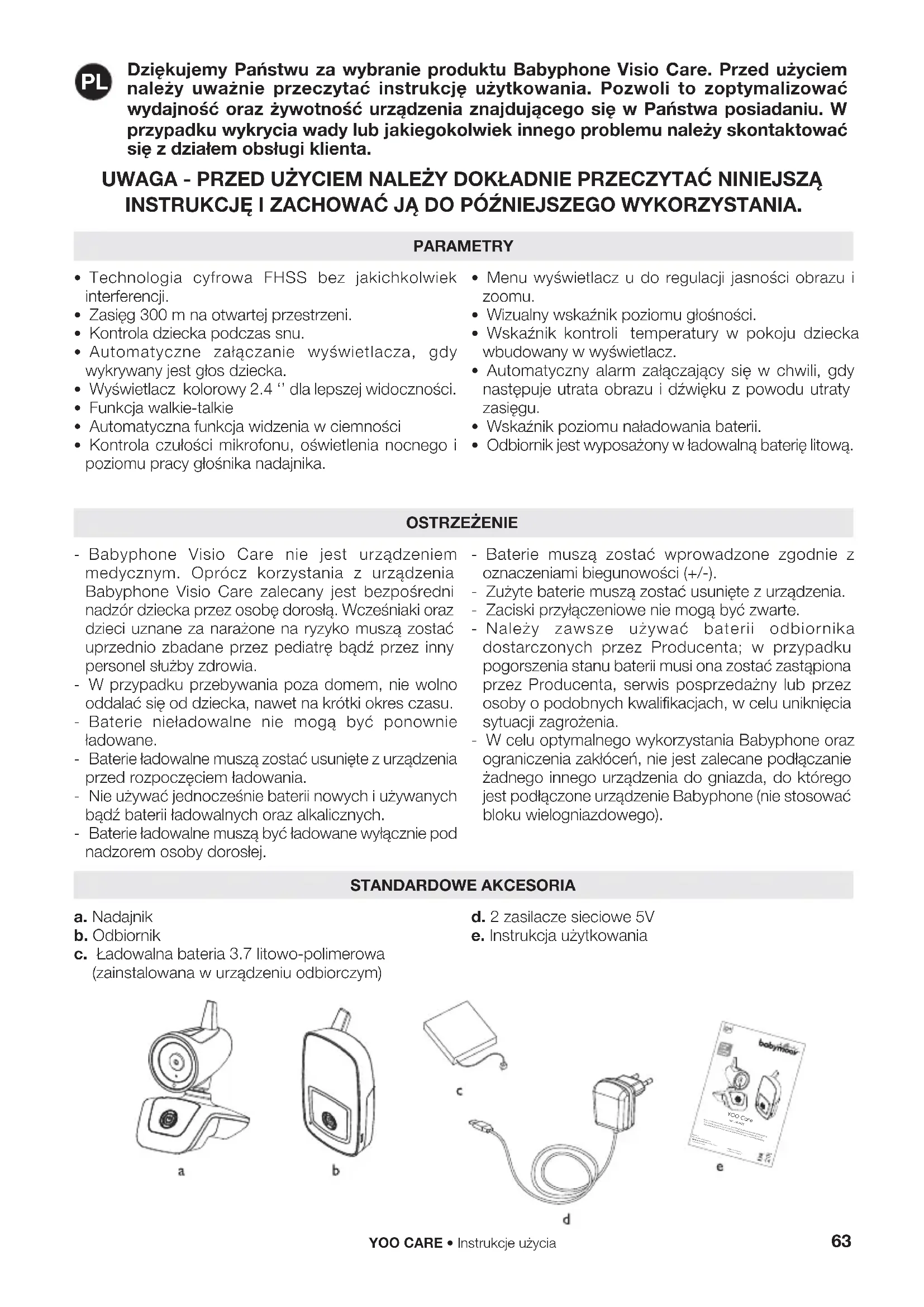 - Wskaźnik poziomu naładowania baterii.• Odbiornik jest wyposażony w ładowalną baterię litową. OSTRZEŻENIE - Babyphone Visio Care nie jest urządzeniem medycznym. Oprócz korzystania z urządzenia Babyphone Visio Care zalecany jest bezpośredni nadzór dziecka przez osobę dorosłą. Wcześniaki oraz dzieci uznane za narażone na ryzyko muszą zostać uprzednio zbadane przez pediatrę bądź przez inny personel służby zdrowia. - W przypadku przebywania poza domem, nie wolno oddalać się od dziecka, nawet na krótki okres czasu. - Baterie nieładowalne nie mogą być ponownie ładowane. - Baterie ładowalne muszą zostać usunięte z urządzenia przed rozpoczęciem ładowania. - Nie używać jednocześnie baterii nowych i używanych bądź baterii ładowalnych oraz alkalicznych. - Baterie ładowalne muszą być ładowane wyłącznie pod nadzorem osoby dorosłej. - Baterie muszą zostać wprowadzone zgodnie z oznaczeniami biegunowości (+/-). - Zużyte baterie muszą zostać usunięte z urządzenia. - Zaciski przyłączeniowe nie mogą być zwarte. - Należy zawsze używać baterii odbiornika dostarczonych przez Producenta; w przypadku pogorszenia stanu baterii musi ona zostać zastąpiona przez Producenta, serwis posprzedażny lub przez osoby o podobnych kwalifikacjach, w celu uniknięcia sytuacji zagrożenia. - W celu optymalnego wykorzystania Babyphone oraz ograniczenia zakłóceń, nie jest zalecane podłączanie żadnego innego urządzenia do gniazda, do którego jest podłączone urządzenie Babyphone (nie stosować bloku wielogniazdowego). STANDARDOWE AKCESORIA a. Nadajnik b. Odbiornik c. Ładowalna bateria 3.7 litowo-polimerowa (zainstalowana w urządzeniu odbiorczym) d. 2 zasilacze sieciowe 5V e. Instrukcja użytkowania BabymoovParc Industriel des Gravanches16, rue Jacqueline Auriol63051 Clermont-Ferrand cedex 2 - Francewww.babymoov.comDesigned and engineer by Babymoov in FranceRéf. : A014422YOO Care Notice d’utilisation • Instructions for use • Benutzungsanleitung • Gebruikshandleiding Instrucciones de uso • Istruzioni per l’uso • Instruções de uso • Návod k použití Használati utasítások • Instrucțiuni de utilizare • Instrukcje użycia • Brugsanvisning64 STEROWANIE