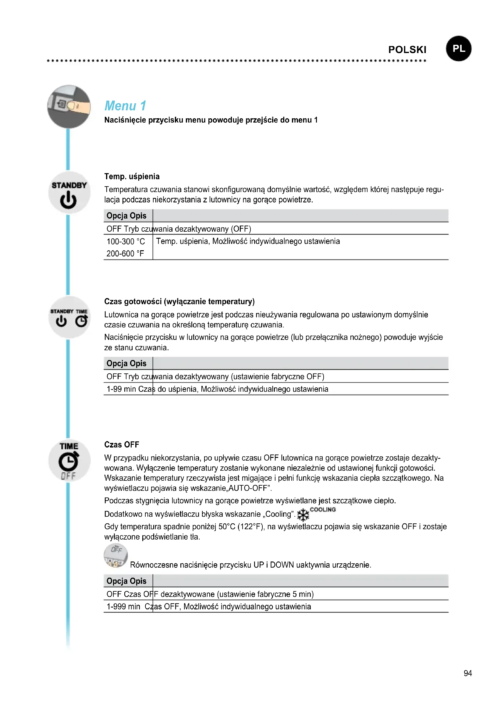ČESKÝ94 Menu 1 Naciśnięcie przycisku menu powoduje przejście do menu 1 Temp. uśpienia Temperatura czuwania stanowi skongurowaną domyślnie wartość, względem której następuje regu- lacja podczas niekorzystania z lutownicy na gorące powietrze. Opcja Opis OFF Tryb czuwania dezaktywowany (OFF) 100-300 °C 200-600 °F Temp. uśpienia, Możliwość indywidualnego ustawienia Czas gotowości (wyłczanie temperatury) Lutownica na gorące powietrze jest podczas nieużywania regulowana po ustawionym domyślnie czasie czuwania na określoną temperaturę czuwania. Naciśnięcie przycisku w lutownicy na gorące powietrze (lub przełącznika nożnego) powoduje wyjście ze stanu czuwania. Opcja Opis OFF Tryb czuwania dezaktywowany (ustawienie fabryczne OFF) 1-99 min Czas do uśpienia, Możliwość indywidualnego ustawienia Czas OFF W przypadku niekorzystania, po upływie czasu OFF lutownica na gorące powietrze zostaje dezakty- wowana. Wyłączenie temperatury zostanie wykonane niezależnie od ustawionej funkcji gotowości. Wskazanie temperatury rzeczywista jest migające i pełni funkcję wskazania ciepła szczątkowego. Na wyświetlaczu pojawia się wskazanie„AUTO-OFF”. Podczas stygnięcia lutownicy na gorące powietrze wyświetlane jest szczątkowe ciepło. Dodatkowo na wyświetlaczu błyska wskazanie „Cooling”. Gdy temperatura spadnie poniżej 50°C (122°F), na wyświetlaczu pojawia się wskazanie OFF i zostaje wyłączone podświetlanie tła. Równoczesne naciśnięcie przycisku UP i DOWN uaktywnia urządzenie. Opcja Opis OFF Czas OFF dezaktywowane (ustawienie fabryczne 5 min) 1-999 min Czas OFF, Możliwość indywidualnego ustawienia