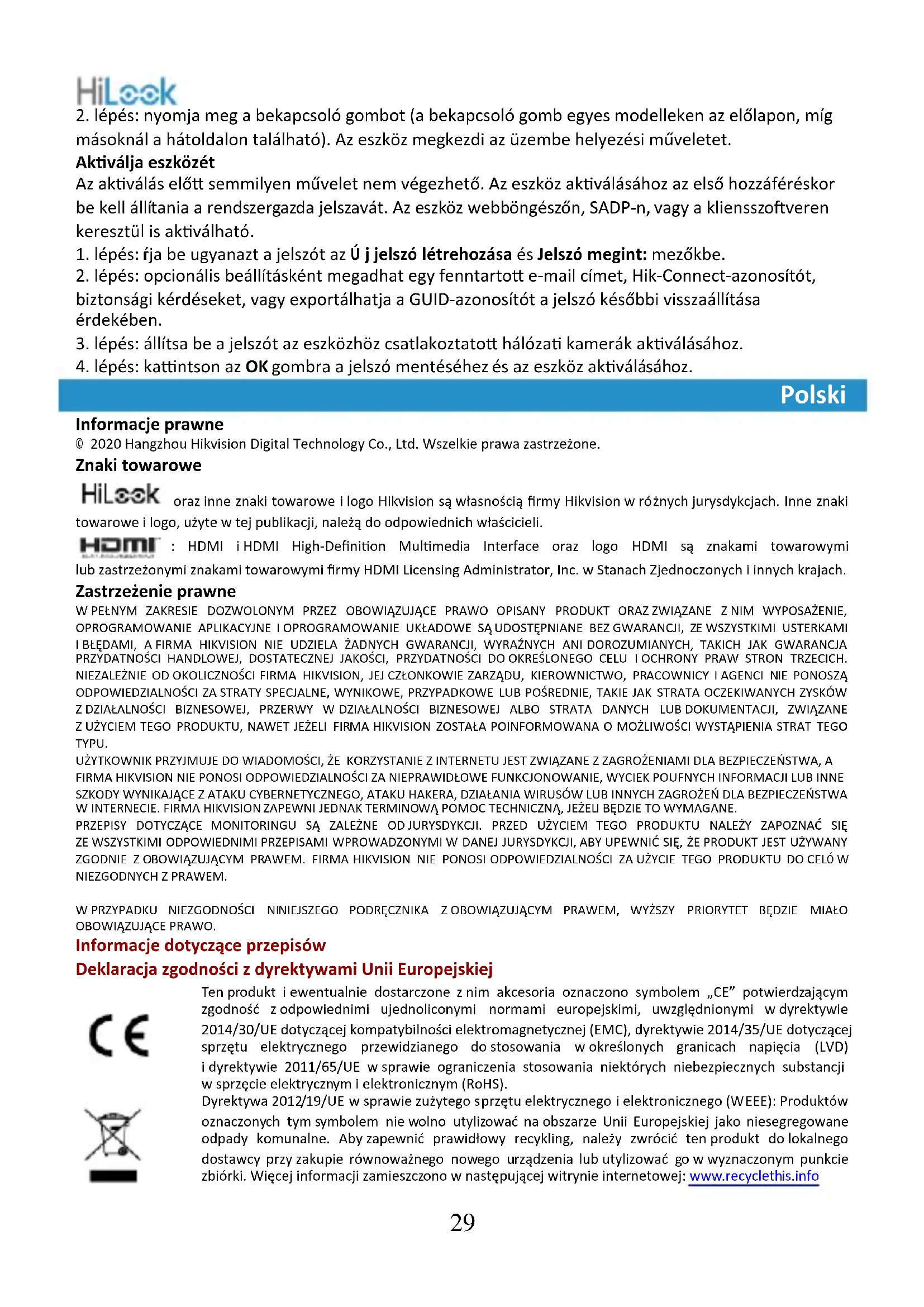 Polski Informacje prawne © 2020 Hangzhou Hikvision Digital Technology Co., Ltd. Wszelkie prawa zastrzeżone. Znaki towarowe oraz inne znaki towarowe i logo Hikvision są własnością firmy Hikvision w różnych jurysdykcjach. Inne znaki towarowe i logo, użyte w tej publikacji, należą do odpowiednich właścicieli. : HDMI i HDMI High-Definition Multimedia Interface oraz logo HDMI są znakami towarowymi lub zastrzeżonymi znakami towarowymi firmy HDMI Licensing Administrator, Inc. w Stanach Zjednoczonych i innych krajach. Zastrzeżenie prawne W PEŁNYM ZAKRESIE DOZWOLONYM PRZEZ OBOWIĄZUJĄCE PRAWO OPISANY PRODUKT ORAZ ZWIĄZANE Z NIM WYPOSAŻENIE, OPROGRAMOWANIE APLIKACYJNE I OPROGRAMOWANIE UKŁADOWE SĄ UDOSTĘPNIANE BEZ GWARANCJI, ZE WSZYSTKIMI USTERKAMI I BŁĘDAMI, A FIRMA HIKVISION NIE UDZIELA ŻADNYCH GWARANCJI, WYRAŹNYCH ANI DOROZUMIANYCH, TAKICH JAK GWARANCJA PRZYDATNOŚCI HANDLOWEJ, DOSTATECZNEJ JAKOŚCI, PRZYDATNOŚCI DO OKREŚLONEGO CELU I OCHRONY PRAW STRON TRZECICH. NIEZALEŻNIE OD OKOLICZNOŚCI FIRMA HIKVISION, JEJ CZŁONKOWIE ZARZĄDU, KIEROWNICTWO, PRACOWNICY I AGENCI NIE PONOSZĄ ODPOWIEDZIALNOŚCI ZA STRATY SPECJALNE, WYNIKOWE, PRZYPADKOWE LUB POŚREDNIE, TAKIE JAK STRATA OCZEKIWANYCH ZYSKÓW Z DZIAŁALNOŚCI BIZNESOWEJ, PRZERWY W DZIAŁALNOŚCI BIZNESOWEJ ALBO STRATA DANYCH LUB DOKUMENTACJI, ZWIĄZANE Z UŻYCIEM TEGO PRODUKTU, NAWET JEŻELI FIRMA HIKVISION ZOSTAŁA POINFORMOWANA O MOŻLIWOŚCI WYSTĄPIENIA STRAT TEGO TYPU. UŻYTKOWNIK PRZYJMUJE DO WIADOMOŚCI, ŻE KORZYSTANIE Z INTERNETU JEST ZWIĄZANE Z ZAGROŻENIAMI DLA BEZPIECZEŃSTWA, A FIRMA HIKVISION NIE PONOSI ODPOWIEDZIALNOŚCI ZA NIEPRAWIDŁOWE FUNKCJONOWANIE, WYCIEK POUFNYCH INFORMACJI LUB INNE SZKODY WYNIKAJĄCE Z ATAKU CYBERNETYCZNEGO, ATAKU HAKERA, DZIAŁANIA WIRUSÓW LUB INNYCH ZAGROŻEŃ DLA BEZPIECZEŃSTWA W INTERNECIE. FIRMA HIKVISION ZAPEWNI JEDNAK TERMINOWĄ POMOC TECHNICZNĄ, JEŻELI BĘDZIE TO WYMAGANE. PRZEPISY DOTYCZĄCE MONITORINGU SĄ ZALEŻNE OD JURYSDYKCJI. PRZED UŻYCIEM TEGO PRODUKTU NALEŻY ZAPOZNAĆ SIĘ ZE WSZYSTKIMI ODPOWIEDNIMI PRZEPISAMI WPROWADZONYMI W DANEJ JURYSDYKCJI, ABY UPEWNIĆ SIĘ, ŻE PRODUKT JEST UŻYWANY ZGODNIE Z OBOWIĄZUJĄCYM PRAWEM. FIRMA HIKVISION NIE PONOSI ODPOWIEDZIALNOŚCI ZA UŻYCIE TEGO PRODUKTU DO CELÓW NIEZGODNYCH Z PRAWEM. W PRZYPADKU NIEZGODNOŚCI NINIEJSZEGO PODRĘCZNIKA Z OBOWIĄZUJĄCYM PRAWEM, WYŻSZY PRIORYTET BĘDZIE MIAŁO OBOWIĄZUJĄCE PRAWO. Informacje dotyczące przepisów Deklaracja zgodności z dyrektywami Unii Europejskiej