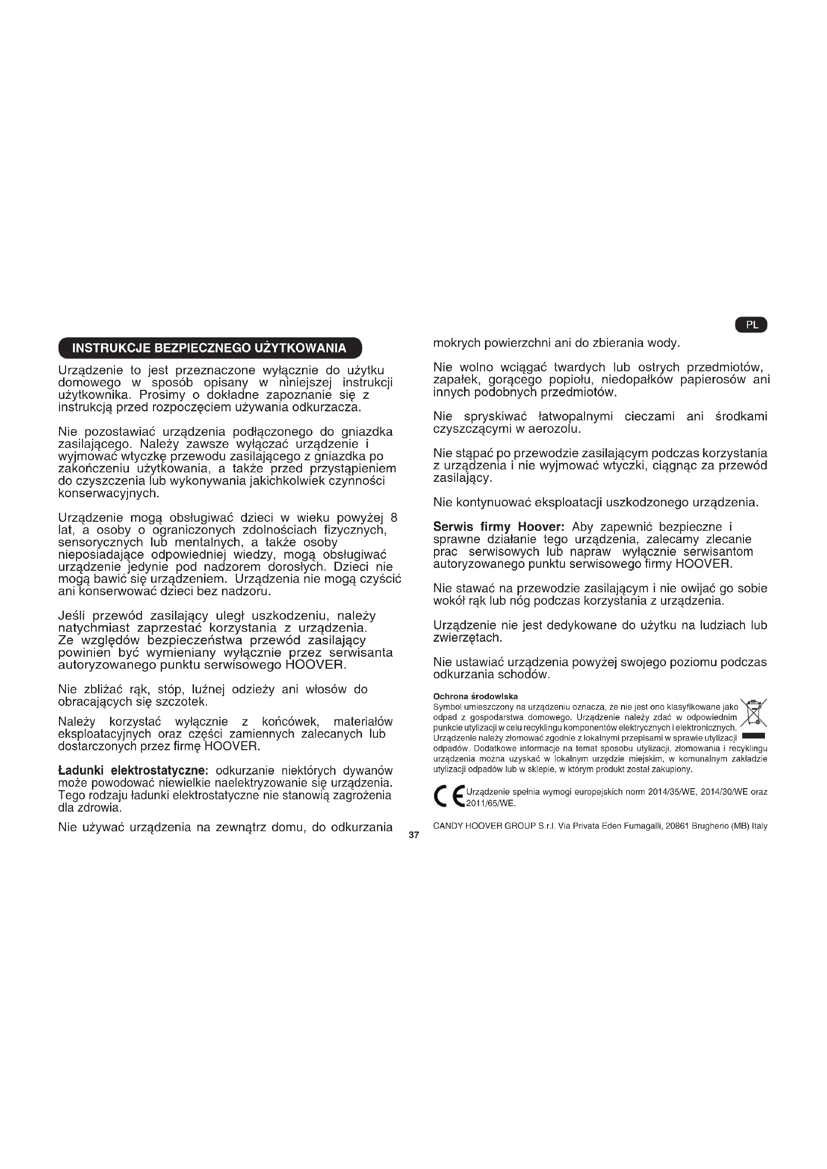 Urządzenie to jest przeznaczone wyłącznie do użytku domowego w sposób opisany w niniejszej instrukcji użytkownika. Prosimy o dokładne zapoznanie się z instrukcją przed rozpoczęciem używania odkurzacza. Nie pozostawiać urządzenia podłączonego do gniazdka zasilającego. Należy zawsze wyłączać urządzenie i wyjmować wtyczkę przewodu zasilającego z gniazdka po zakończeniu użytkowania, a także przed przystąpieniem do czyszczenia lub wykonywania jakichkolwiek czynności konserwacyjnych. Urządzenie mogą obsługiwać dzieci w wieku powyżej 8 lat, a osoby o ograniczonych zdolnościach zycznych, sensorycznych lub mentalnych, a także osoby nieposiadające odpowiedniej wiedzy, mogą obsługiwać urządzenie jedynie pod nadzorem dorosłych. Dzieci nie mogą bawić się urządzeniem. Urządzenia nie mogą czyścić ani konserwować dzieci bez nadzoru. Jeśli przewód zasilający uległ uszkodzeniu, należy natychmiast zaprzestać korzystania z urządzenia. Ze względów bezpieczeństwa przewód zasilający powinien być wymieniany wyłącznie przez serwisanta autoryzowanego punktu serwisowego HOOVER. Nie zbliżać rąk, stóp, luźnej odzieży ani włosów do obracających się szczotek. Należy korzystać wyłącznie z końcówek, materiałów eksploatacyjnych oraz części zamiennych zalecanych lub dostarczonych przez rmę HOOVER. Ładunki elektrostatyczne: odkurzanie niektórych dywanów może powodować niewielkie naelektryzowanie się urządzenia. Tego rodzaju ładunki elektrostatyczne nie stanowią zagrożenia dla zdrowia. Nie używać urządzenia na zewnątrz domu, do odkurzania mokrych powierzchni ani do zbierania wody. Nie wolno wciągać twardych lub ostrych przedmiotów, zapałek, gorącego popiołu, niedopałków papierosów ani innych podobnych przedmiotów. Nie spryskiwać łatwopalnymi cieczami ani środkami czyszczącymi w aerozolu. Nie stąpać po przewodzie zasilającym podczas korzystania z urządzenia i nie wyjmować wtyczki, ciągnąc za przewód zasilający. Nie kontynuować eksploatacji uszkodzonego urządzenia. Serwis rmy Hoover: Aby zapewnić bezpieczne i sprawne działanie tego urządzenia, zalecamy zlecanie prac serwisowych lub napraw wyłącznie serwisantom autoryzowanego punktu serwisowego rmy HOOVER. Nie stawać na przewodzie zasilającym i nie owijać go sobie wokół rąk lub nóg podczas korzystania z urządzenia. Urządzenie nie jest dedykowane do użytku na ludziach lub zwierzętach. Nie ustawiać urządzenia powyżej swojego poziomu podczas odkurzania schodów. Ochrona środowiska Symbol umieszczony na urządzeniu oznacza, że nie jest ono klasykowane jako odpad z gospodarstwa domowego. Urządzenie należy zdać w odpowiednim punkcie utylizacji w celu recyklingu komponentów elektrycznych i elektronicznych. Urządzenie należy złomować zgodnie z lokalnymi przepisami w sprawie utylizacji odpadów. Dodatkowe informacje na temat sposobu utylizacji, złomowania i recyklingu urządzenia można uzyskać w lokalnym urzędzie miejskim, w komunalnym zakładzie utylizacji odpadów lub w sklepie, w którym produkt został zakupiony. Urządzenie spełnia wymogi europejskich norm 2014/35/WE, 2014/30/WE oraz 2011/65/WE. CANDY HOOVER GROUP S.r.l. Via Privata Eden Fumagalli, 20861 Brugherio (MB) Italy PL38 *Tylko w niektórych modelach **Kształt szczotek i końcówek może różnić się w zależności od modelu ELEMENTY ODKURZACZA
