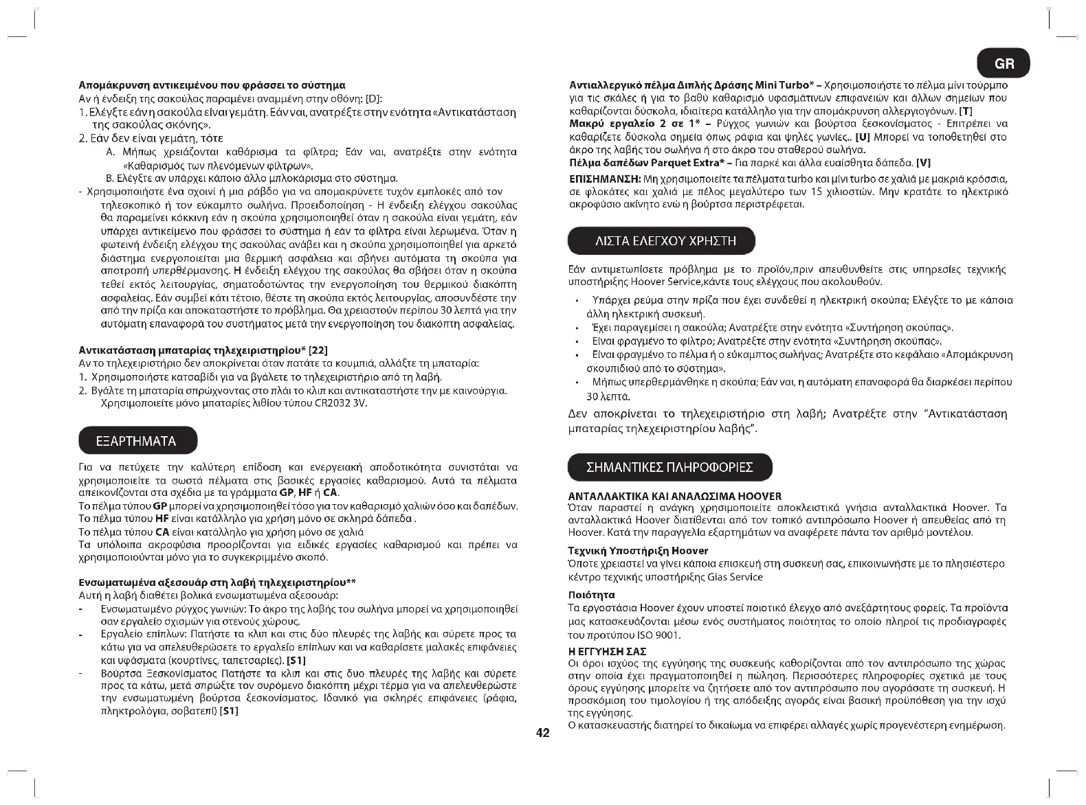 Urządzenie to jest przeznaczone wyłącznie do użytku domowego w sposób opisany w niniejszej instrukcji użytkownika. Prosimy o dokładne zapoznanie się z instrukcją przed rozpoczęciem używania odkurzacza. Nie pozostawiać urządzenia podłączonego do gniazdka zasilającego. Należy zawsze wyłączać urządzenie i wyjmować wtyczkę przewodu zasilającego z gniazdka po zakończeniu użytkowania, a także przed przystąpieniem do czyszczenia lub wykonywania jakichkolwiek czynności konserwacyjnych. Urządzenie mogą obsługiwać dzieci w wieku co najmniej 8 lat, a osoby o ograniczonych zdolnościach zycznych, sensorycznych lub mentalnych, a także osoby nieposiadające odpowiedniego doświadczenia oraz wiedzy, jedynie pod warunkiem że odbywać się będzie to pod nadzorem lub po przeszkoleniu na temat bezpiecznego użycia urządzenia oraz związanych z nim zagrożeń. Dzieci nie mogą bawić się urządzeniem. Urządzenia nie powinny czyścić ani konserwować dzieci bez nadzoru. Jeśli przewód zasilający uległ uszkodzeniu, należy natychmiast zaprzestać korzystania z urządzenia. Ze względów bezpieczeństwa, przewód zasilający powinien zostać wymieniony przez serwisanta autoryzowanego punktu serwisowego rmy Hoover. Nie zbliżać rąk, stóp, luźnej odzieży ani włosów do obracających się szczotek. Należy korzystać wyłącznie z końcówek, materiałów eksploatacyjnych oraz części zamiennych zalecanych lub dostarczonych przez rmę HOOVER. Ładunki elektrostatyczne: Odkurzanie niektórych dywanów może powodować niewielkie naelektryzowanie się odkurzacza. Tego rodzaju ładunki elektrostatyczne nie stanowią zagrożenia dla zdrowia. Nie używać urządzenia na zewnątrz domu, do odkurzania mokrych powierzchni ani do zbierania wody. Nie wolno wciągać twardych lub ostrych przedmiotów, zapałek, gorącego popiołu, niedopałków papierosów ani innych podobnych przedmiotów. Nie spryskiwać łatwopalnymi cieczami, środkami czyszczącymi w aerozolu ani parą. Nie stąpać po przewodzie zasilającym podczas korzystania z urządzenia i nie wyjmować wtyczki, ciągnąc za przewód zasilający. Nie kontynuować eksploatacji uszkodzonego urządzenia. Nie stawać na przewodzie zasilającym i nie owijać go sobie wokół rąk lub nóg podczas korzystania z urządzenia. Nie używać urządzenia do odkurzania ludzi lub zwierząt. Nie ustawiać urządzenia powyżej swojego poziomu podczas odkurzania schodów. Przechowywać baterie w miejscu niedostępnym dla dzieci. W razie połknięcia baterii bezzwłocznie skontaktować się z lekarzem. Wyczerpane baterie należy wyjąć z urządzenia i w bezpieczny sposób usunąć. Jeśli urządzenie będzie przechowywane przez długi czas i nie będzie używane, należy wyjąć z niego baterie i bezpiecznie przechować. Jeżeli urządzenie ma być złomowane, należy z niego najpierw usunąć akumulatory. Podczas wyjmowania akumulatora urządzenie musi być odłączone od zasilania. Akumulatory należy utylizować w sposób bezpieczny dla środowiska. Używać tylko baterii litowych CR2032 3V. Baterie nie są przeznaczone do ponownego ładowania. Baterie należy wkładać, zwracając uwagę na prawidłowe ułożenie biegunów. Biegun dodatni “+” powinien być u góry. [24] Baterie nie nadają się do ponownego ładowania. Nie wolno dopuszczać do zwarcia styków baterii. Serwis rmy Hoover: Aby zapewnić bezpieczne i sprawne działanie tego urządzenia, zalecamy zlecanie prac serwisowych lub napraw wyłącznie serwisantom autoryzowanego punktu serwisowego rmy HOOVER. Ochrona środowiska Symbol umieszczony na urządzeniu oznacza, że nie jest ono klasykowane jako odpad z gospodarstwa domowego. Urządzenie należy zdać w odpowiednim punkcie utylizacji w celu recyklingu komponentów elektrycznych i elektronicznych. Urządzenie należy złomować zgodnie z lokalnymi przepisami w sprawie utylizacji odpadów. Dodatkowe informacje na temat sposobu utylizacji, złomowania i recyklingu urządzenia można uzyskać w lokalnym urzędzie miejskim, w komunalnym zakładzie utylizacji odpadów lub w sklepie, w którym produkt został zakupiony. Candy Hoover Group Srl niniejszym oświadcza, że urządzenie oznaczone znakiem spełnia podstawowe wymogi Dyrektyw 2014/53/UE oraz 2011/65/UE. Aby otrzymać kopię deklaracji zgodności, proszę skontaktować się z producentem na stronie: www.candy-group.com CANDY HOOVER GROUP S.r.l. Via Privata Eden Fumagalli, 20861 Brugherio (MB) Italy Pasma częstotliwości 300Mhz ~ 450Mhz Maksymalna moc sygnału radiowego przenoszonego w paśmie częstotliwości 11 dBm PL44