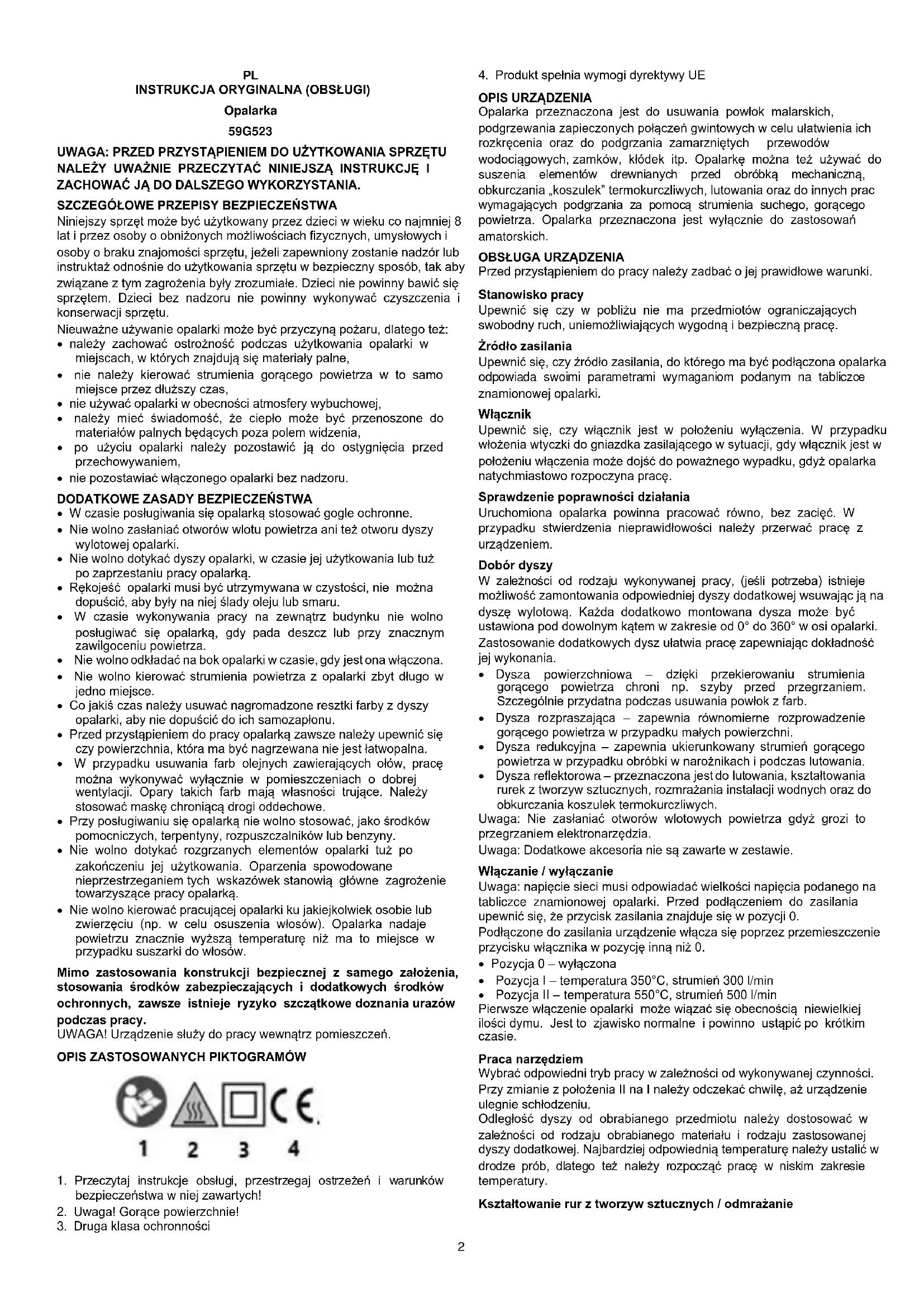 - Nie wolno kierować pracującej opalarki ku jakiejkolwiek osobie lub zwierzęciu (np. w celu osuszenia włosów). Opalarka nadaje powietrzu znacznie wyższą temperaturę niż ma to miejsce w przypadku suszarki do włosów. Mimo zastosowania konstrukcji bezpiecznej z samego założenia, stosowania środków zabezpieczających i dodatkowych środków ochronnych, zawsze istnieje ryzyko szczątkowe doznania urazów podczas pracy. UWAGA! Urządzenie służy do pracy wewnątrz pomieszczeń.