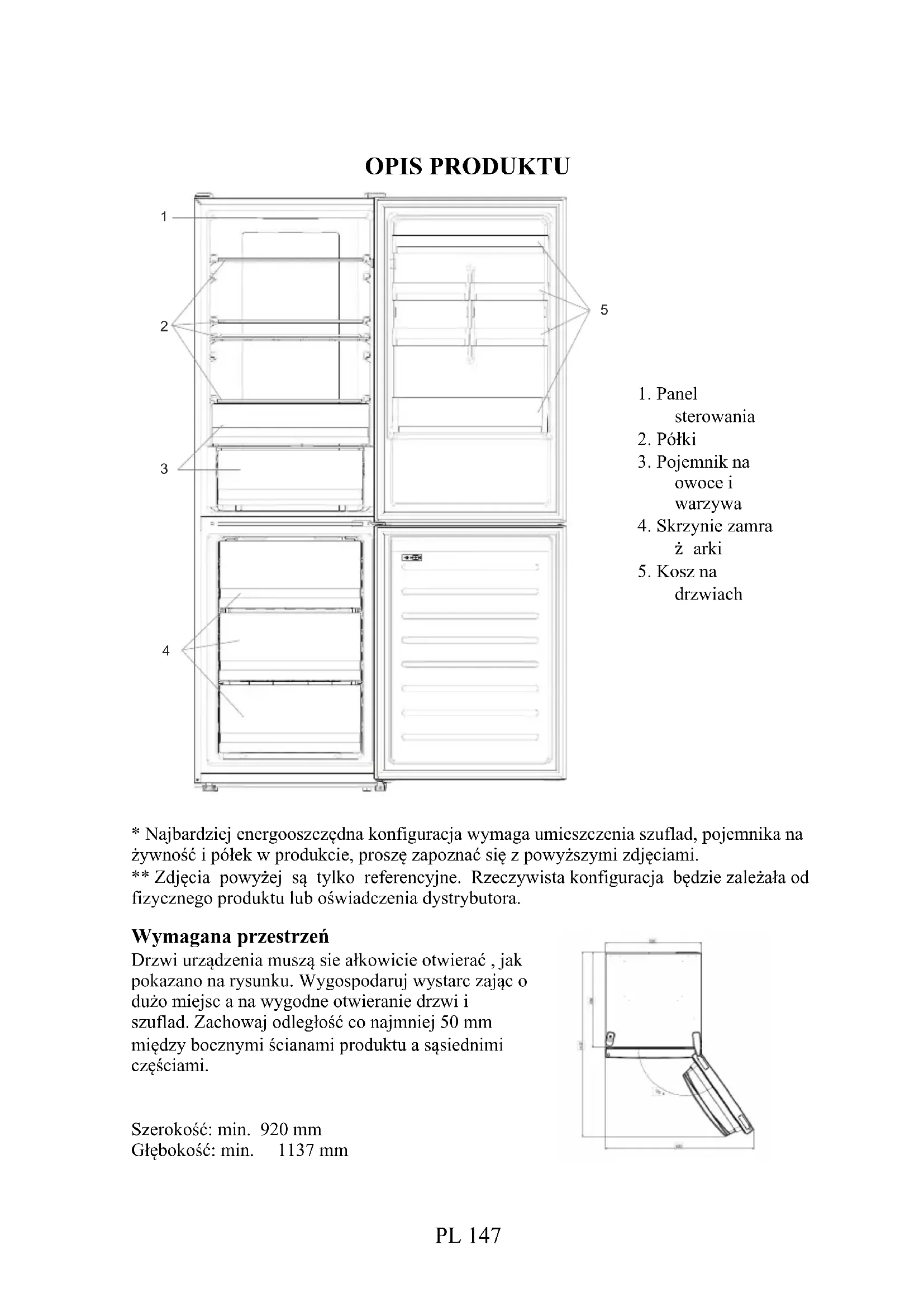 - Najbardziej energooszczędna konfiguracja wymaga umieszczenia szuflad, pojemnika na żywność i półek w produkcie, proszę zapoznać się z powyższymi zdjęciami. ** Zdjęcia powyżej są tylko referencyjne. Rzeczywista konfiguracja będzie zależała od fizycznego produktu lub oświadczenia dystrybutora. Wymagana przestrzeń Drzwi urządzenia muszą sie ałkowicie otwierać , jak pokazano na rysunku. Wygospodaruj wystarc zając o dużo miejsc a na wygodne otwieranie drzwi i szuflad. Zachowaj odległość co najmniej 50 mm między bocznymi ścianami produktu a sąsiednimi częściami. Szerokość: min. 920 mm Głębokość: min. 1137 mm