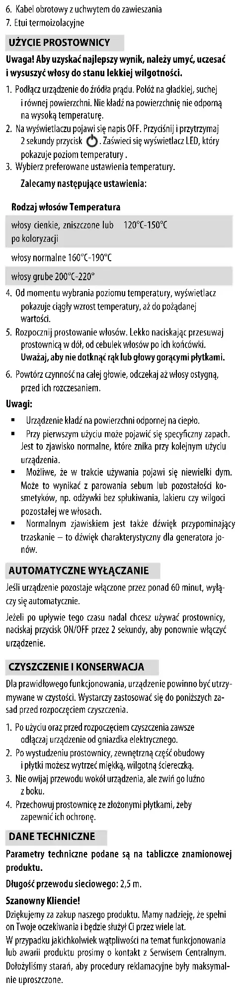 Zalecamy następujące ustawienia: Rodzaj włosów Temperatura włosy cienkie, zniszczone lub po koloryzacji 120°C-150°C włosy normalne 160°C-190°C włosy grube 200°C-220°