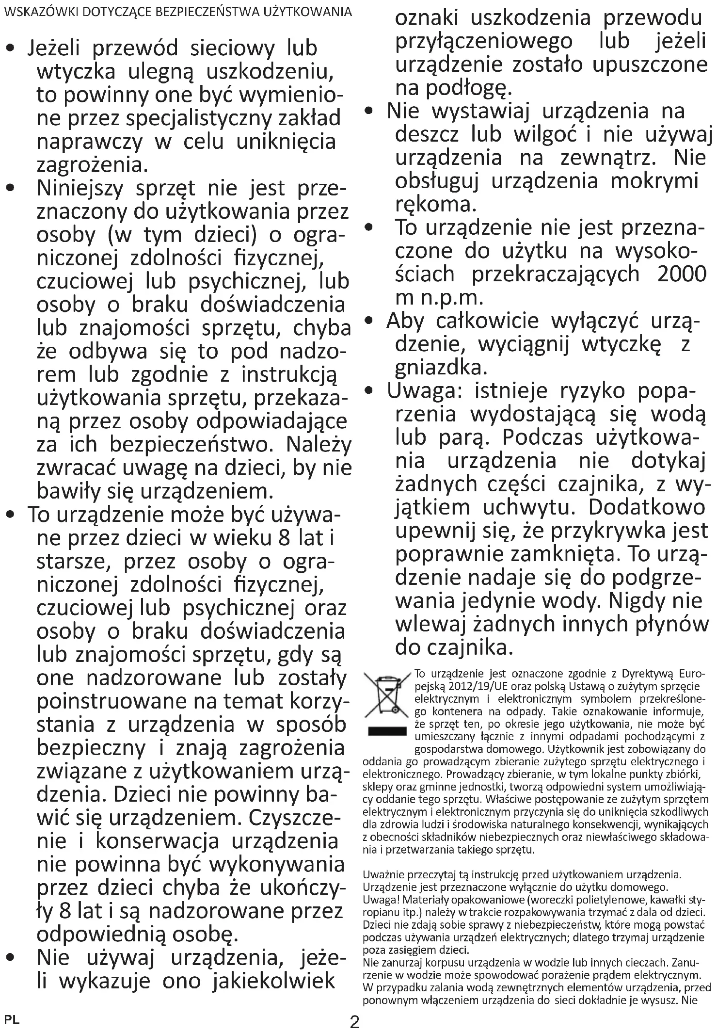 - Uwaga: istnieje ryzyko popa- rzenia wydostającą się wodą lub parą. Podczas użytkowa- nia urządzenia nie dotykaj żadnych części czajnika, z wy- jątkiem uchwytu. Dodatkowo upewnij się, że przykrywka jest poprawnie zamknięta. To urzą- dzenie nadaje się do podgrze- wania jedynie wody. Nigdy nie wlewaj żadnych innych płynów do czajnika. To urządzenie jest oznaczone zgodnie z Dyrektywą Euro- pejską 2012/19/UE oraz polską Ustawą o zużytym sprzęcie elektrycznym i elektronicznym symbolem przekreślone- go kontenera na odpady. Takie oznakowanie informuje, że sprzęt ten, po okresie jego użytkowania, nie może być umieszczany łącznie z innymi odpadami pochodzącymi z gospodarstwa domowego. Użytkownik jest zobowiązany do oddania go prowadzącym zbieranie zużytego sprzętu elektrycznego i elektronicznego. Prowadzący zbieranie, w tym lokalne punkty zbiórki, sklepy oraz gminne jednostki, tworzą odpowiedni system umożliwiają- cy oddanie tego sprzętu. Właściwe postępowanie ze zużytym sprzętem elektrycznym i elektronicznym przyczynia się do uniknięcia szkodliwych dla zdrowia ludzi i środowiska naturalnego konsekwencji, wynikających z obecności składników niebezpiecznych oraz niewłaściwego składowa- nia i przetwarzania takiego sprzętu. Uważnie przeczytaj tą instrukcję przed użytkowaniem urządzenia. Urządzenie jest przeznaczone wyłącznie do użytku domowego. Uwaga! Materiały opa ko wa nio we (wo recz ki po li ety le no we, kawałki sty ro pia nu itp.) na le ży w trakcie rozpakowywania trzy mać z dala od dzieci. Dzieci nie zdają sobie sprawy z niebezpieczeństw, które mogą powstać podczas używania urządzeń elektrycznych; dlatego trzymaj urządzenie poza zasięgiem dzieci. Nie zanurzaj korpusu urządzenia w wodzie lub innych cieczach. Zanu- rzenie w wodzie może spowodować porażenie prądem elektrycznym. W przypadku zalania wodą zewnętrznych elementów urządzenia, przed ponownym włączeniem urządzenia do sieci dokładnie je wysusz. Nie PL3