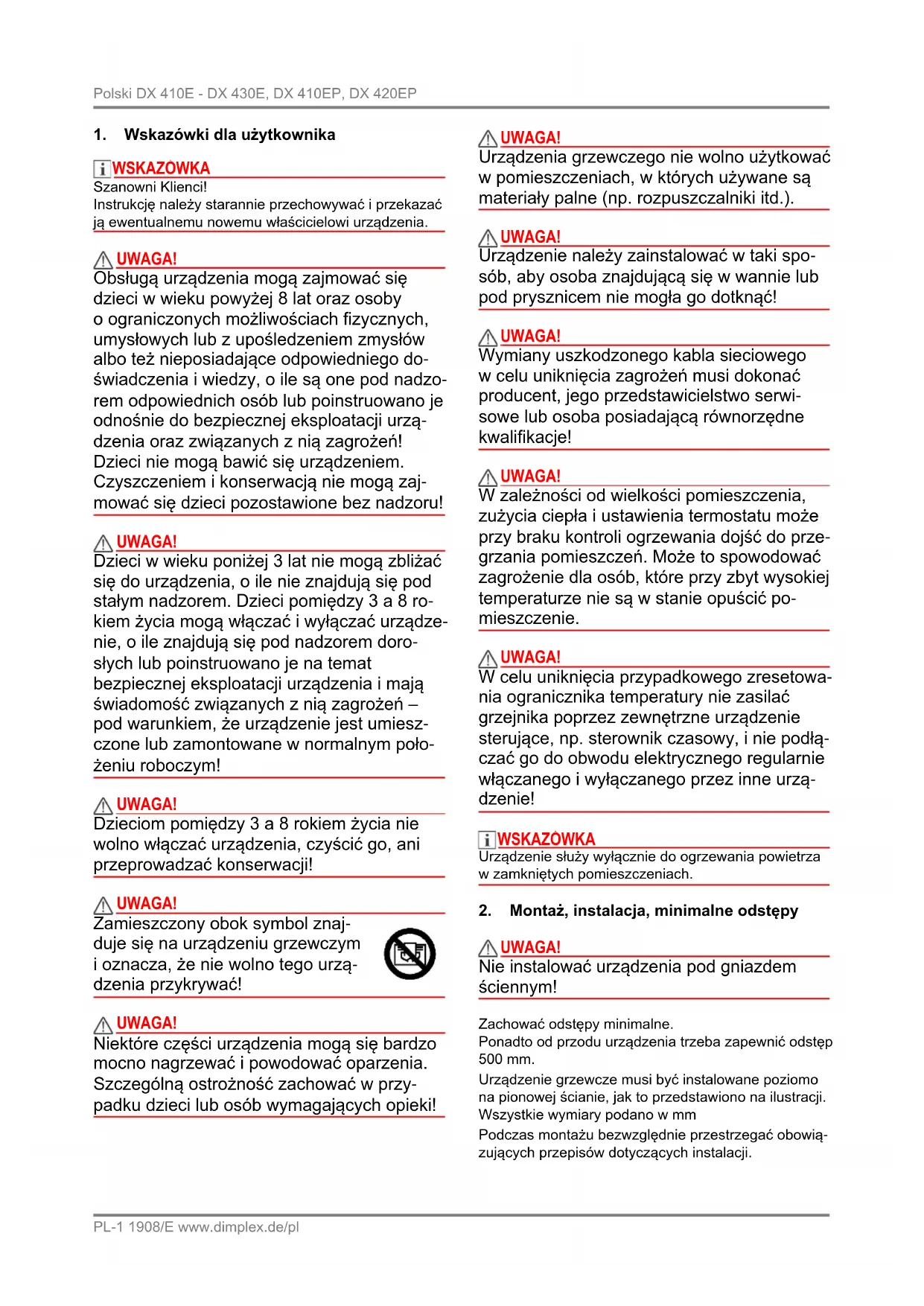 UWAGA! Nie instalować urządzenia pod gniazdem ściennym! Zachować odstępy minimalne. Ponadto od przodu urządzenia trzeba zapewnić odstęp 500 mm. Urządzenie grzewcze musi być instalowane poziomo na pionowej ścianie, jak to przedstawiono na ilustracji. Wszystkie wymiary podano w mm Podczas montażu bezwzględnie przestrzegać obowią- zujących przepisów dotyczących instalacji.www.dimplex.de/pl 1908/E PL-2 DX 410E - DX 430E, DX 410EP, DX 420EP Polski Sieciowe gniazdo przyłączeniowe urządzenia musi być dostępne po montażu. Należy zwrócić uwagę na niezakłócony wlot i wylot po- wietrza w górnej i w dolnej części urządzenia