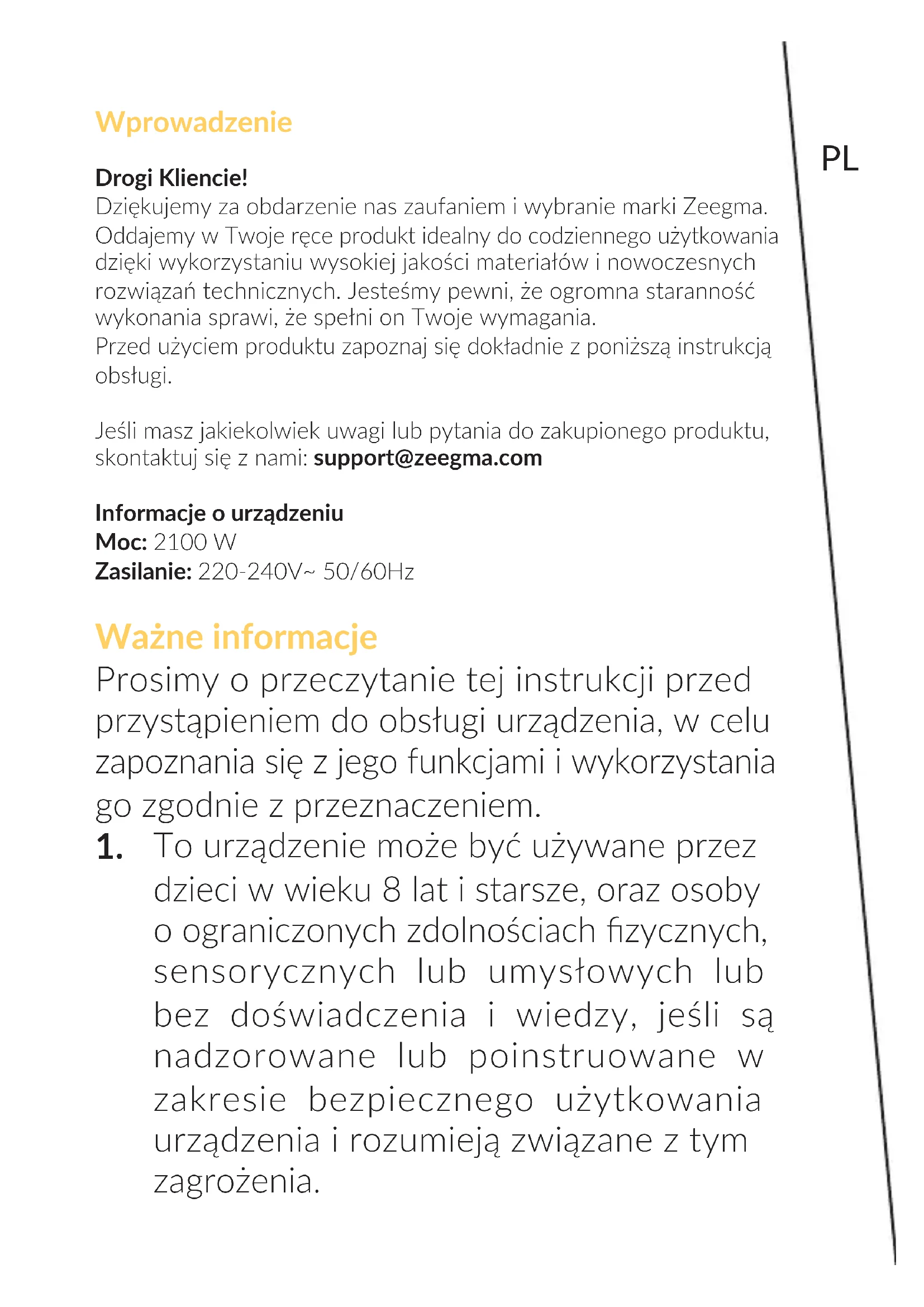 Nach jedem Gebrauch des Gerätes ist die Auangschale herauszunehmen und zu entleeren (9, Abb. A). Waschen Sie die Schale mit warmem Wasser und milden Reinigungsmieln und trocknen Sie sie dann mit einem weichen Tuch ab. Die gezeigten Bilder dienen nur als Referenz. Das tatsächliche Produkt kann von den Abbildungen abweichen.PL Wprowadzenie Drogi Kliencie! Dziękujemy za obdarzenie nas zaufaniem i wybranie marki Zeegma. Oddajemy w Twoje ręce produkt idealny do codziennego użytkowania dzięki wykorzystaniu wysokiej jakości materiałów i nowoczesnych rozwiązań technicznych. Jesteśmy pewni, że ogromna staranność wykonania sprawi, że spełni on Twoje wymagania. Przed użyciem produktu zapoznaj się dokładnie z poniższą instrukcją obsługi. Jeśli masz jakiekolwiek uwagi lub pytania do zakupionego produktu, skontaktuj się z nami: support@zeegma.com Informacje o urządzeniu Moc: 2100 W Zasilanie: 220-240V~ 50/60Hz Ważne informacje Prosimy o przeczytanie tej instrukcji przed przystąpieniem do obsługi urządzenia, w celu zapoznania się z jego funkcjami i wykorzystania go zgodnie z przeznaczeniem.