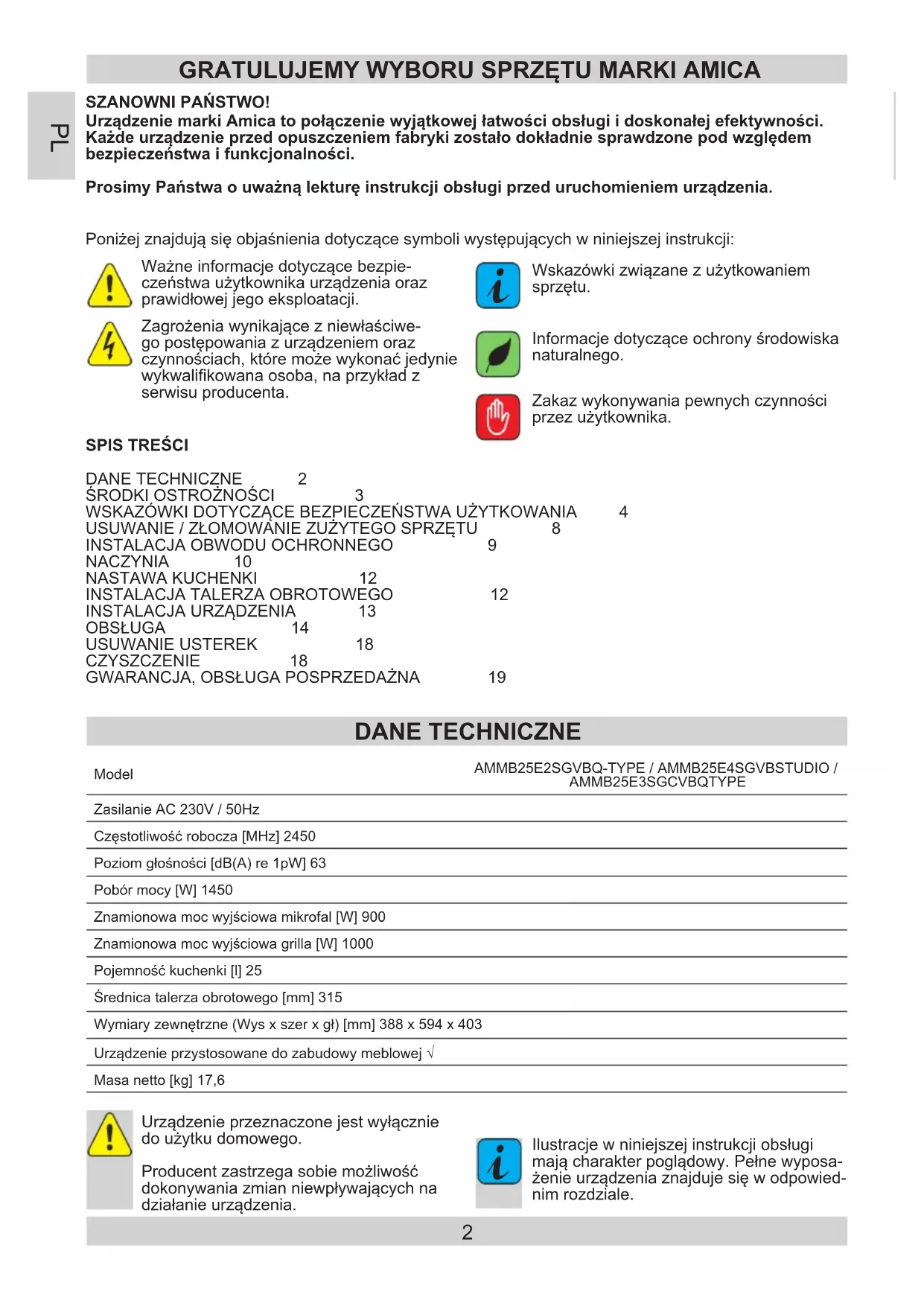 Ilustracje w niniejszej instrukcji obsługi mają charakter poglądowy. Pełne wyposa- żenie urządzenia znajduje się w odpowied- nim rozdziale. ModelAMMB25E2SGVBQ-TYPE / AMMB25E4SGVBSTUDIO / AMMB25E3SGCVBQTYPEZasilanie AC 230V / 50HzCzęstotliwość robocza [MHz] 2450Poziom głośności [dB(A) re 1pW] 63Pobór mocy [W] 1450Znamionowa moc wyjściowa mikrofal [W] 900Znamionowa moc wyjściowa grilla [W] 1000Pojemność kuchenki [l] 25Średnica talerza obrotowego [mm] 315Wymiary zewnętrzne (Wys x szer x gł) [mm] 388 x 594 x 403Urządzenie przystosowane do zabudowy meblowej √Masa netto [kg] 17,6 DANE TECHNICZNE SPISTREŚCI DANE TECHNICZNE 2