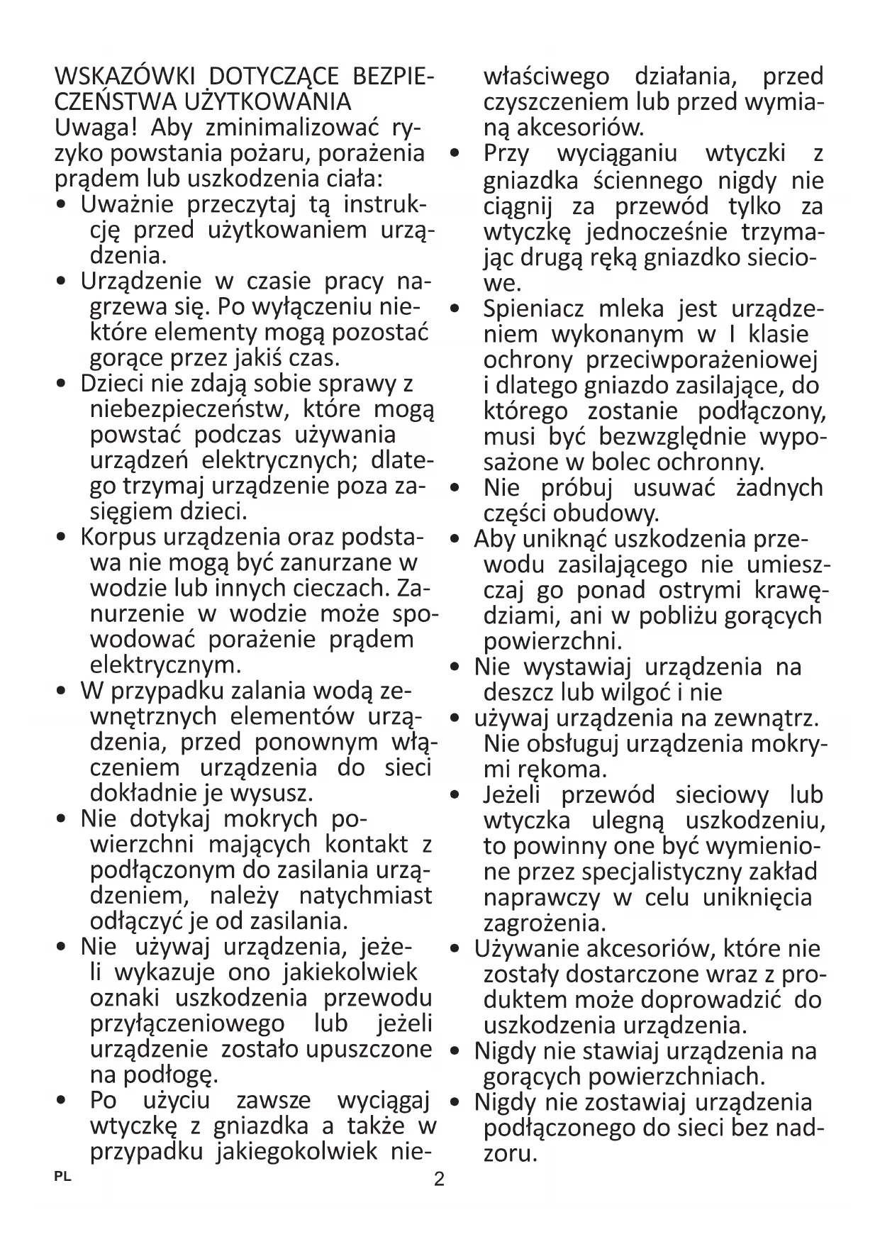- Spieniacz mleka jest urządze- niem wykonanym w I klasie ochrony przeciwporażeniowej i dlatego gniazdo zasilające, do którego zostanie podłączony, musi być bezwzględnie wypo- sażone w bolec ochronny.