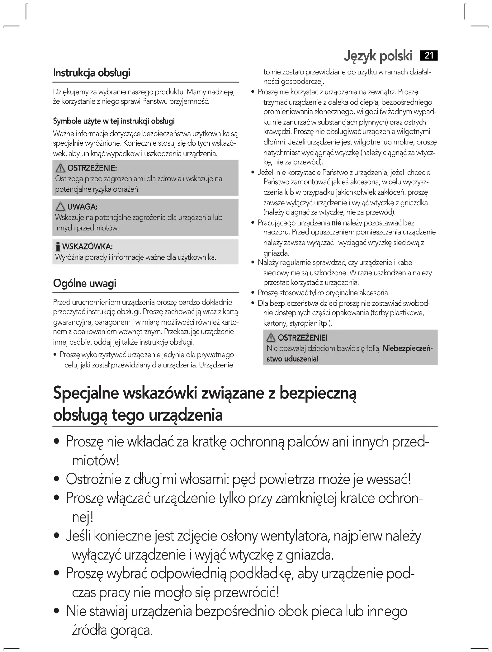Instrukcja obsługi Dziękujemy za wybranie naszego produktu. Mamy nadzieję, że korzystanie z niego sprawi Państwu przyjemność.Symbole użyte w tej instrukcji obsługiWażne informacje dotyczące bezpieczeństwa użytkownika są specjalnie wyróżnione. Koniecznie stosuj się do tych wskazó-wek, aby uniknąć wypadków i uszkodzenia urządzenia. OSTRZEŻENIE:Ostrzega przed zagrożeniami dla zdrowia i wskazuje na potencjalne ryzyka obrażeń. UWAGA:Wskazuje na potencjalne zagrożenia dla urządzenia lub innych przedmiotów. WSKAZÓWKA: Wyróżnia porady i informacje ważne dla użytkownika. Ogólne uwagi Przed uruchomieniem urządzenia proszę bardzo dokładnie przeczytać instrukcję obsługi. Proszę zachować ją wraz z kartą gwarancyjną, paragonem i w miarę możliwości również karto-nem z opakowaniem wewnętrznym. Przekazując urządzenie innej osobie, oddaj jej także instrukcję obsługi.• Proszę wykorzystywać urządzenie jedynie dla prywatnego celu, jaki został przewidziany dla urządzenia. Urządzenie to nie zostało przewidziane do użytku w ramach działal-ności gospodarczej. • Proszę nie korzystać z urządzenia na zewnątrz. Proszę trzymać urządzenie z daleka od ciepła, bezpośredniego promieniowania słonecznego, wilgoci (w żadnym wypad-ku nie zanurzać w substancjach płynnych) oraz ostrych krawędzi. Proszę nie obsługiwać urządzenia wilgotnymi dłońmi. Jeżeli urządzenie jest wilgotne lub mokre, proszę natychmiast wyciągnąć wtyczkę (należy ciągnąć za wtycz-kę, nie za przewód). • Jeżeli nie korzystacie Państwo z urządzenia, jeżeli chcecie Państwo zamontować jakieś akcesoria, w celu wyczysz-czenia lub w przypadku jakichkolwiek zakłóceń, proszę zawsze wyłączyć urządzenie i wyjąć wtyczkę z gniazdka (należy ciągnąć za wtyczkę, nie za przewód).• Pracującego urządzenia nie należy pozostawiać bez nadzoru. Przed opuszczeniem pomieszczenia urządzenie należy zawsze wyłączać i wyciągać wtyczkę sieciową z gniazda.• Należy regularnie sprawdzać, czy urządzenie i kabel sieciowy nie są uszkodzone. W razie uszkodzenia należy przestać korzystać z urządzenia.• Proszę stosować tylko oryginalne akcesoria.• Dla bezpieczeństwa dzieci proszę nie zostawiać swobod-nie dostępnych części opakowania (torby plastikowe, kartony, styropian itp.). OSTRZEŻENIE! Nie pozwalaj dzieciom bawić się folią. Niebezpieczeń-stwo uduszenia! Specjalne wskazówki związane z bezpieczną obsługą tego urządzenia